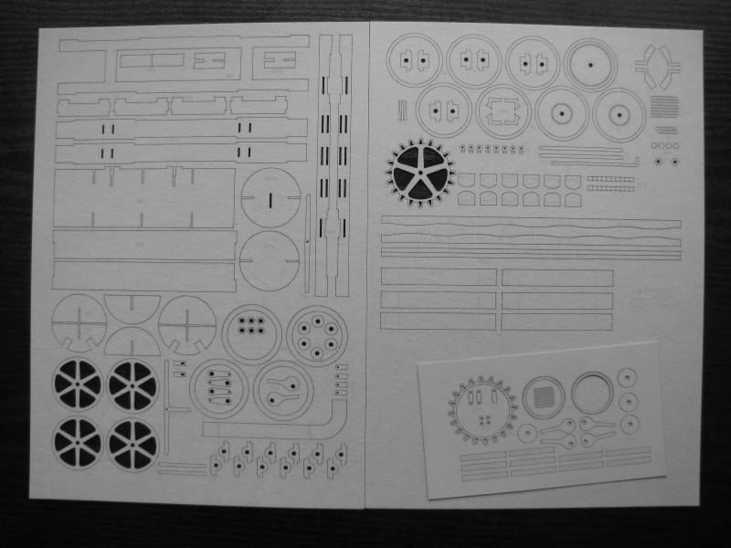 Набір для лазерної вирізки включає елементи каркаса, які в оригінальному вирізі вимагають склеювання відповідної товщини картону. Елементи з набору точно вирізаються лазерним плотером відразу в картоні відповідної товщини і вимагають лише виштовхування з аркуша пальцем (з'єднуються лише маленькими «лапками»).
