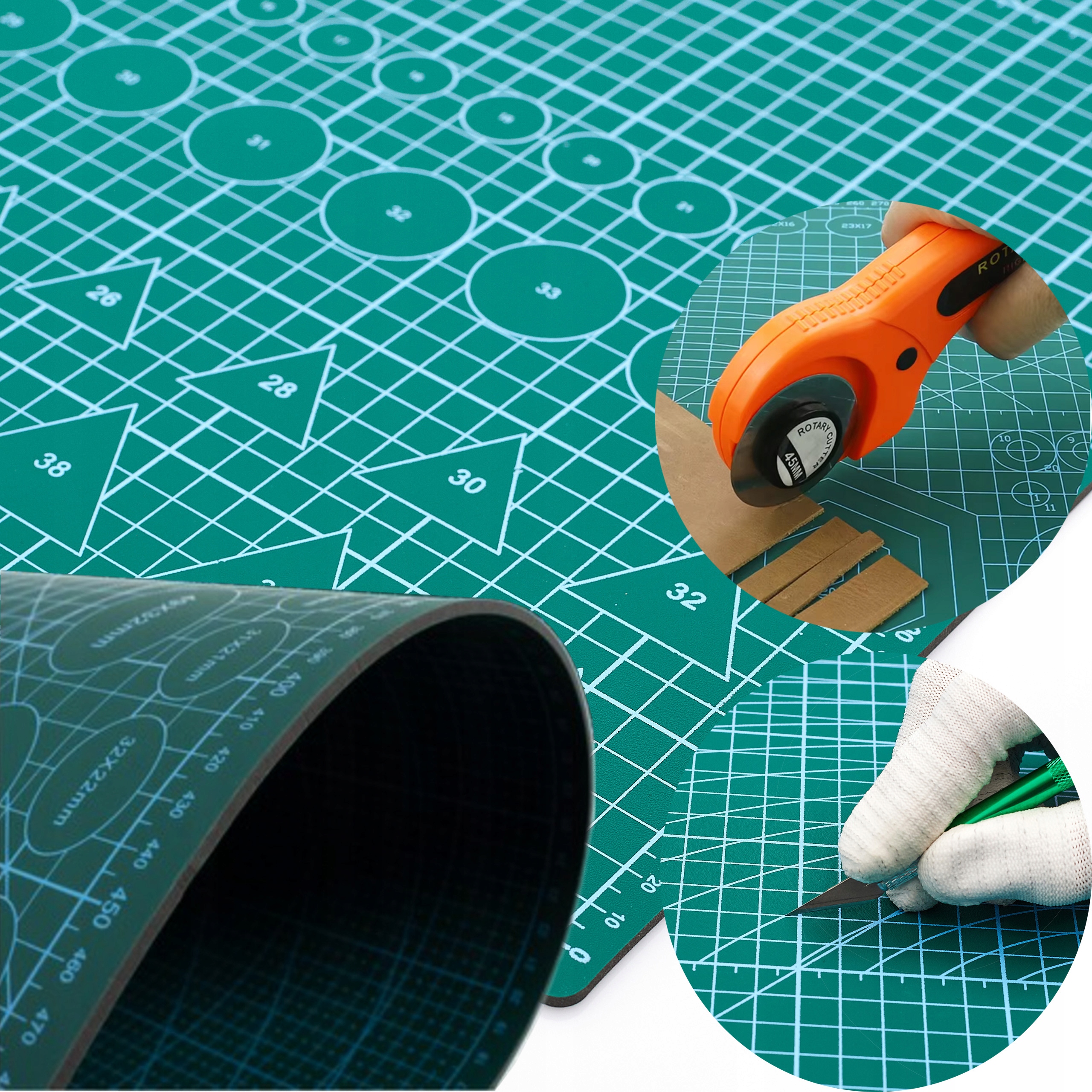 Килимок виготовлено зі спеціального матеріалу, який має властивості самовідновлення – він частково відновлюється після розрізання лезом. Після різання килимок залишається гладким. Килимок двосторонній - на ньому нанесена шкала, допоміжні лінії та цифри, які знадобляться під час роботи, кожна сторона має свій принт. Килимок відмінно підійде в якості підкладки під робочий або письмовий стіл, а також може використовуватися під час моделювання або роботи в офісі. Килимок можна різати скальпелем, циркулярним або сегментним ножем.