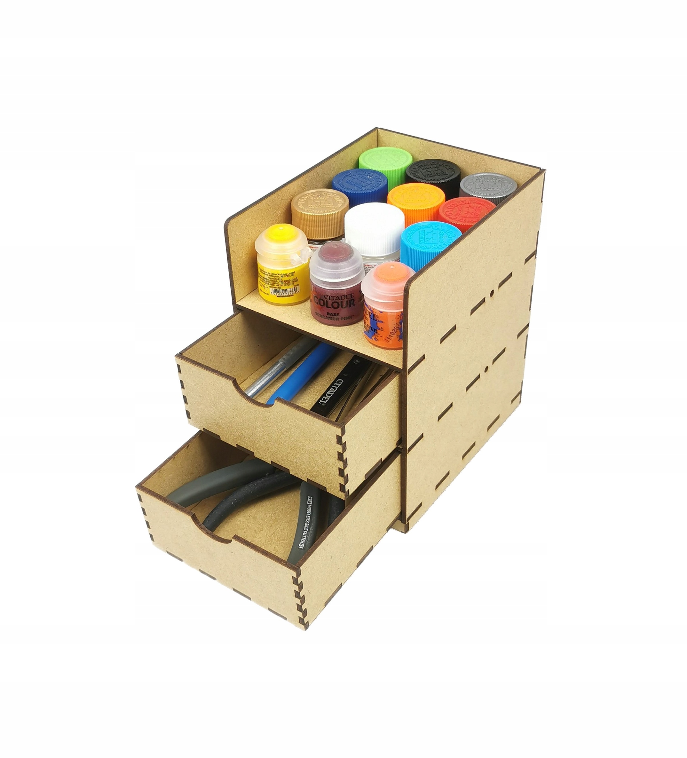 Органайзер містить два містких висувних ящика та полицю, що дозволяє легко та впорядковано зберігати всі необхідні аксесуари для моделювання. Крім того, виріб дуже просто зібрати, що забезпечує швидке та просте використання.