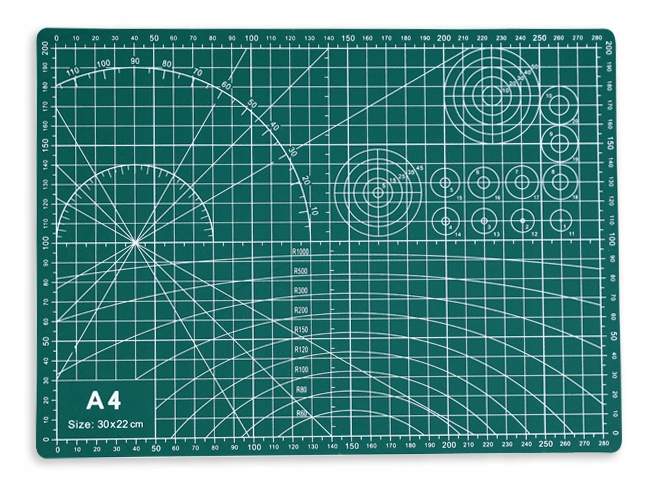 Килимок має позначені сантиметрові напрямні, які допомагають виміряти ідеальний розмір. Він також має напрямні для вимірювання кутів, необхідних для вирізання геометричних фігур.