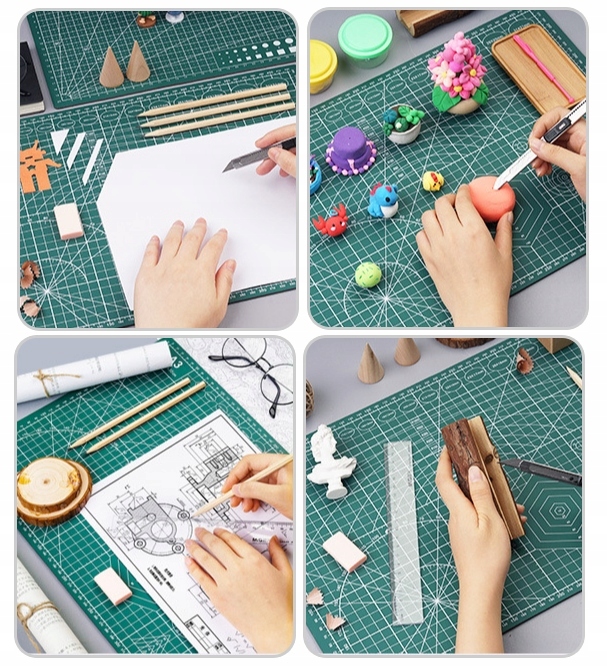 Двосторонній килимок має нековзку поверхню і ідеально підходить для різання різних видів матеріалів, таких як картон або тканина.