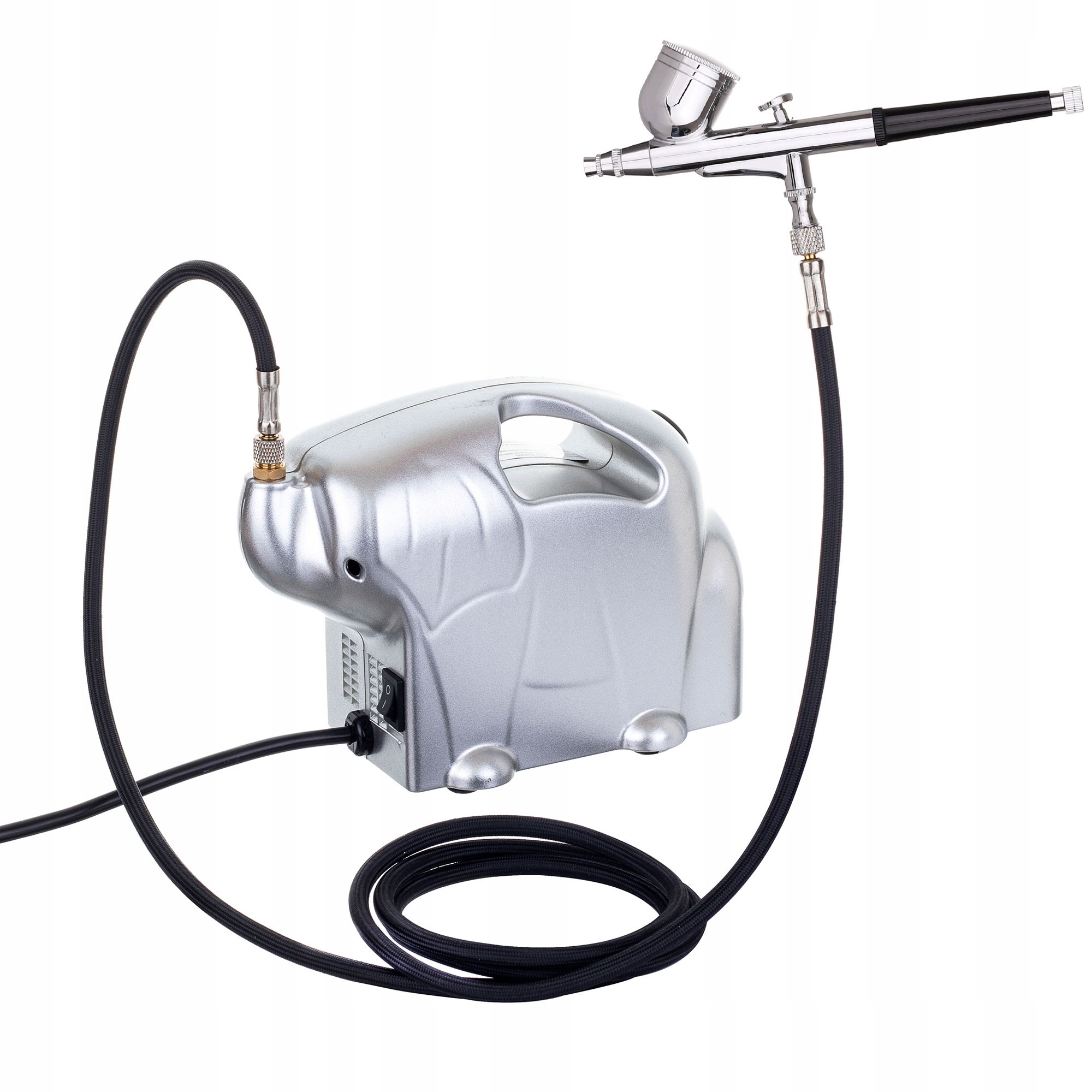 Компресор у формі слона - невеликий за розміром, легкий, тихий і надзвичайно простий у використанні, завдяки завдяки своїй ефективності він ідеально працює з аерографом, який додається до набору.