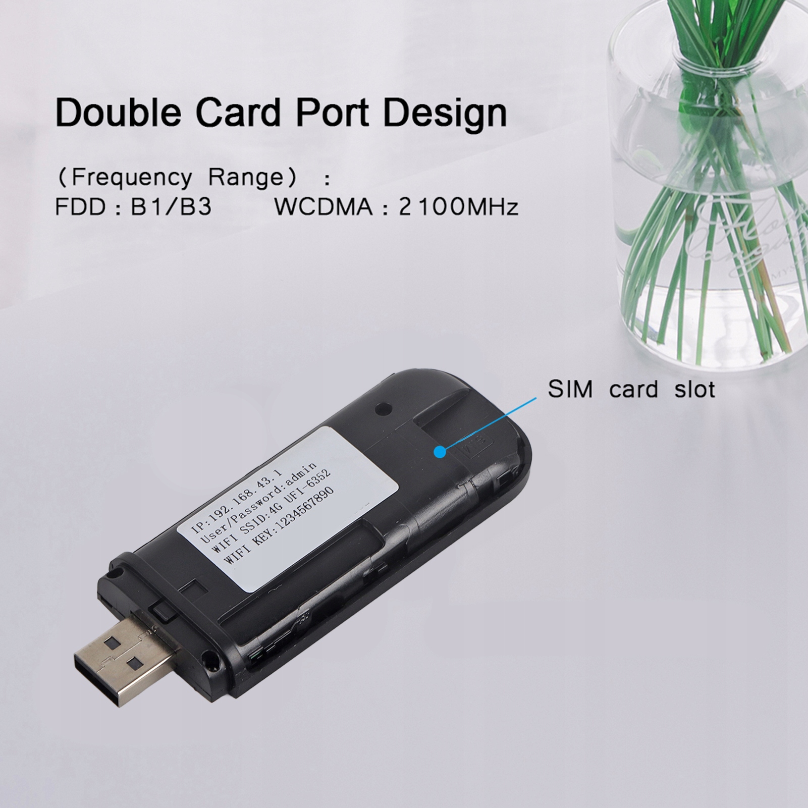 Зовнішній інтерфейс: USB 2.1, стандартний 6-контактний інтерфейс SIM-карти SIM-карта: стандартна SIM-карта, розмір: 15 × 25 мм (не включено) Діапазон частот: FDD: B1/B3/B5