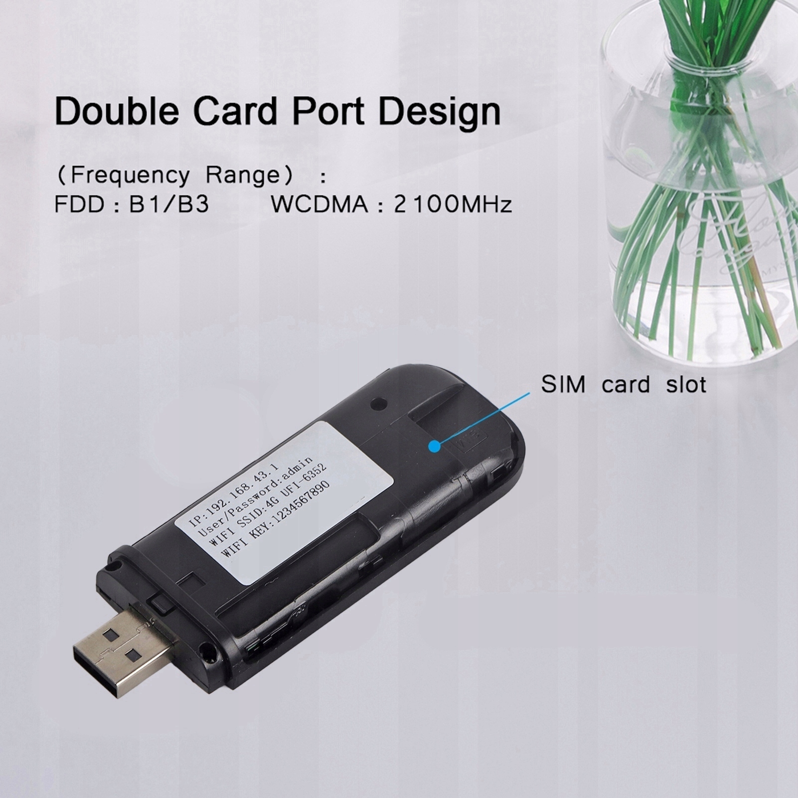 Зовнішній інтерфейс: USB 2.1, стандартний 6-контактний інтерфейс SIM-карти SIM-карта: стандартна SIM-карта, розмір: 15 × 25 мм (не входить у комплект) Діапазон частот: FDD: B1/B3/B5