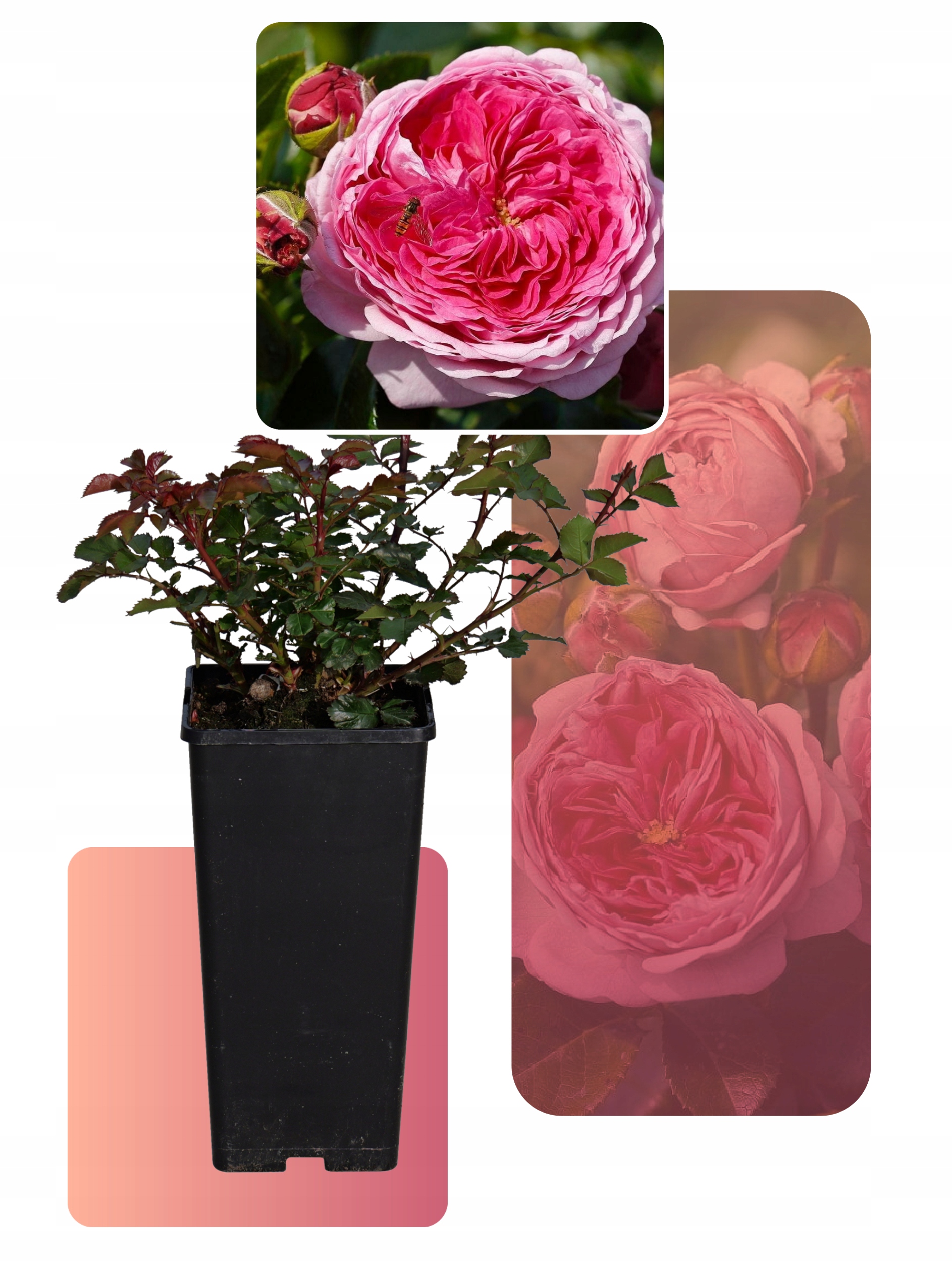 Красива, насичена квітів, за своєю будовою відноситься до англійських троянд. Вони злегка сферичні і плоскі в розкритому вигляді. Центр квітки більш інтенсивний і дуже рожевий, а зовнішні пелюстки світліші. Після розкриття часто видно крихітні золотисті пильовики, а пелюстки злегка хвилясті, що надає цьому сорту певної романтичності.