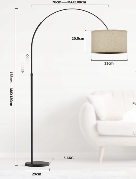 - Висота цього арочного лампи можна відрегулювати залежно від розміру кімнати або особистих уподобань (висота: 165-180 см; відстань випинання екрана: 70-108 см). Крім того, бежевий лляний відтінок підходить для різних стилів внутрішніх приміщень, адаптації до всіх меблів, візуально розширює внутрішній простір, тоді як атмосфера покращиться.