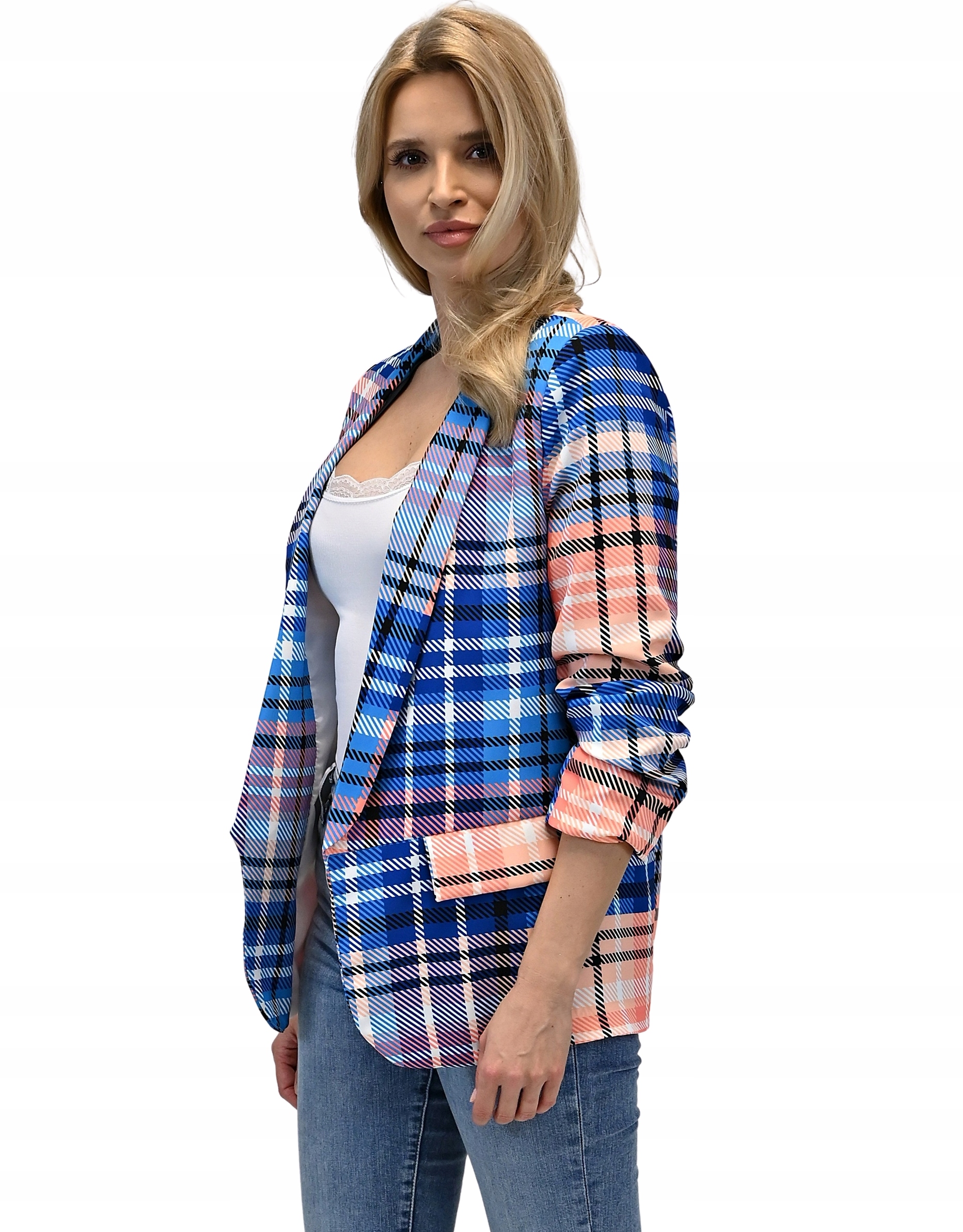 Унікальний, модний, вільний піджак з оригінальною строкатою кліткою насичених кольорів. Довша модель, комір-смокінг Драповані рукава 3/4 додають оригінального характеру. Дві імітації кишень з боків з ефектними клапанами прикрашають куртку. Дизайн для схуднення з підкладкою та м’якими підплічниками. Чудова якість, ідеальна обробка!