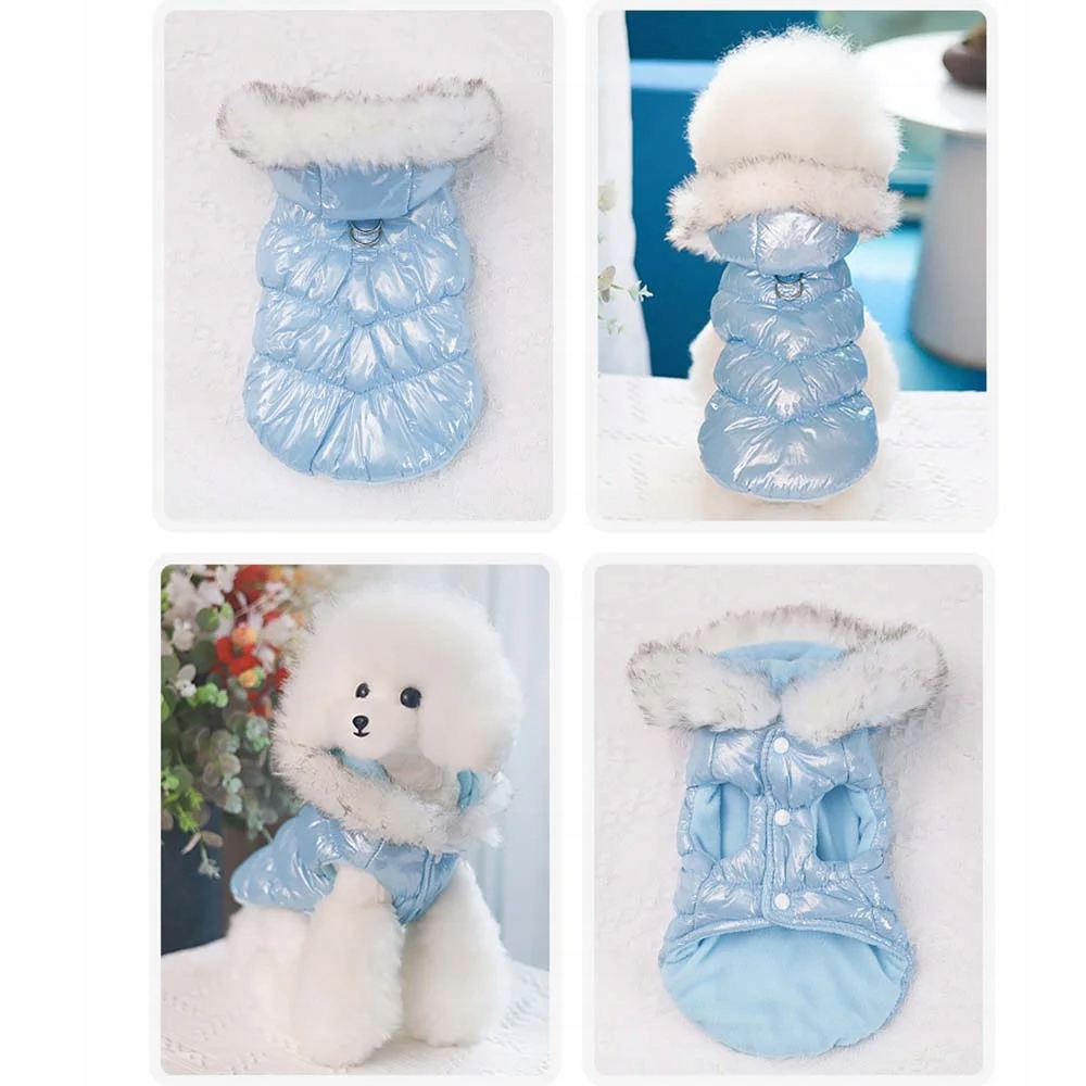 Матеріал, з якого виготовлена куртка, переливається, що додає елегантності та робить вашу собаку стильною під час прогулянок. Куртка також має капюшон, який додатково захищає голову собаки від холоду.