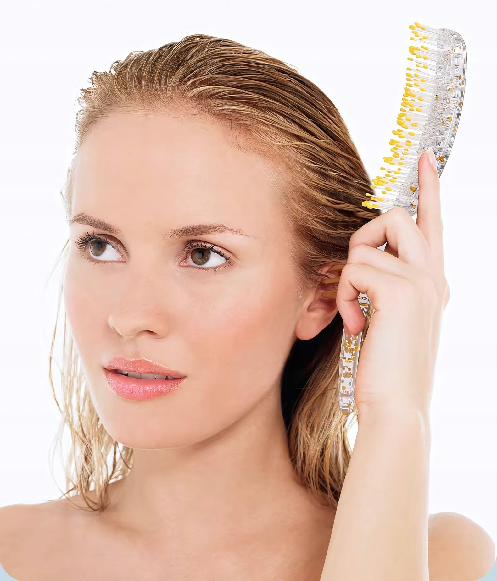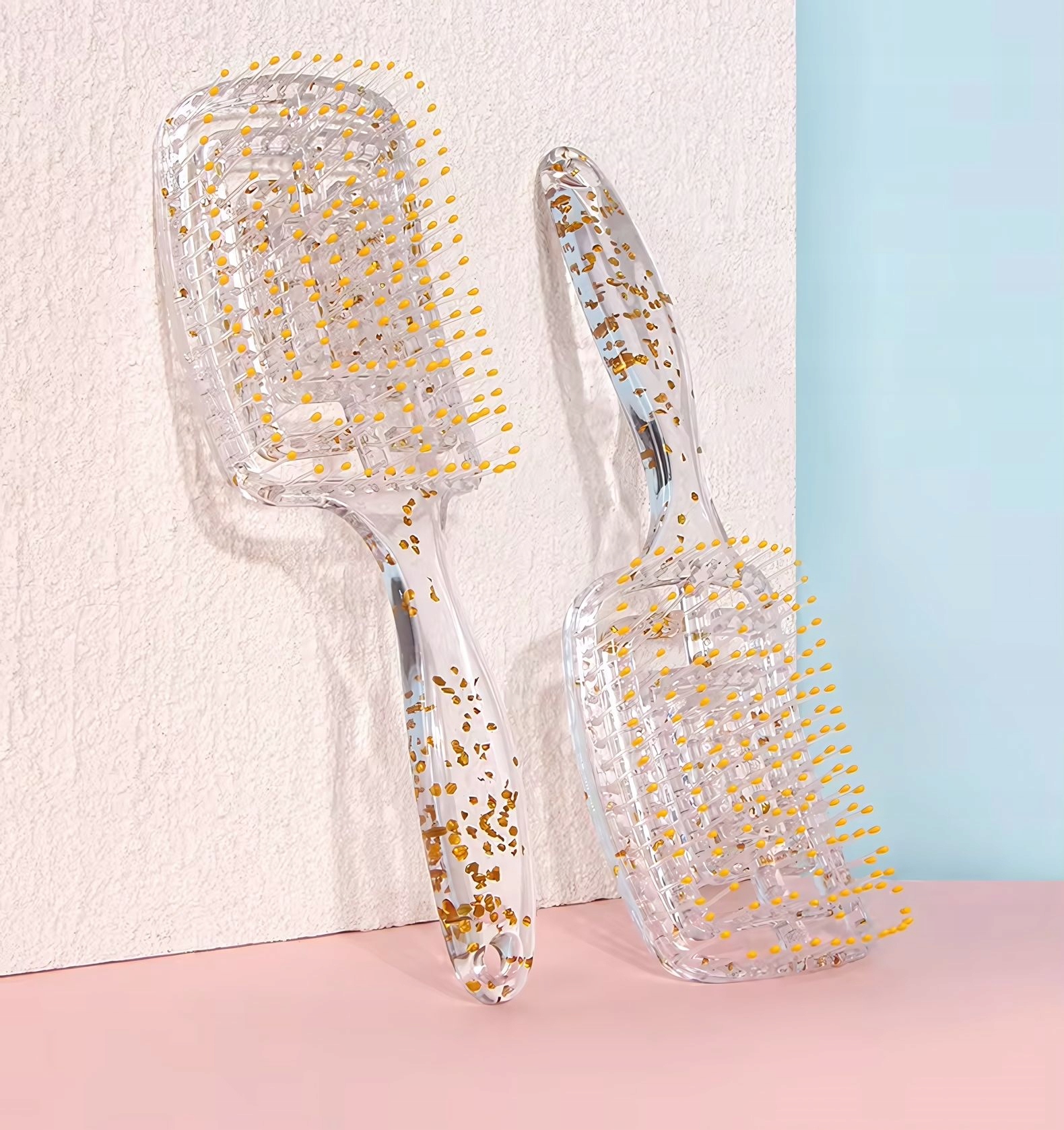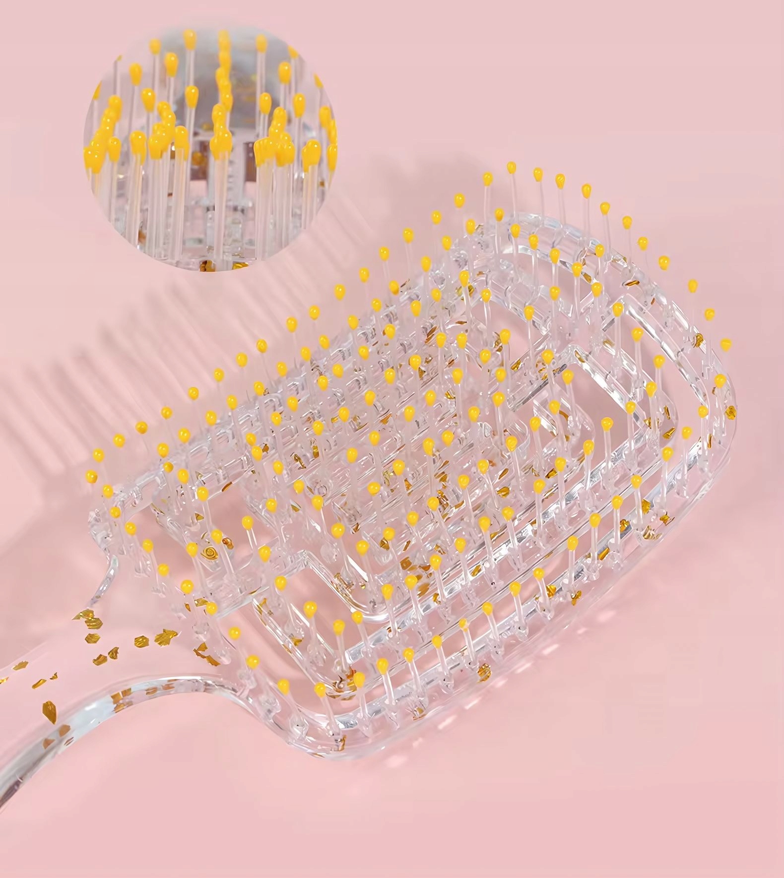 Унікальна конструкція дозволяє ефективно розчісувати волосся, не пошкоджуючи його, збільшуючи при цьому його обсяг. Прозорий дизайн із додаванням золотистого пару додає елегантність, що робить щітку не тільки функціональним, але й стильним.