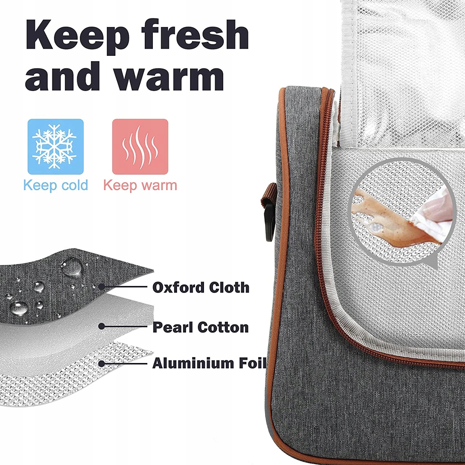- Високоякісний матеріал: міцна оксфордська тканина та ізольована алюмінієва фольга зберігають їжу свіжою протягом багатьох годин, нетоксичною та безпечною для їжі; простий у чищенні та водонепроникний матеріал