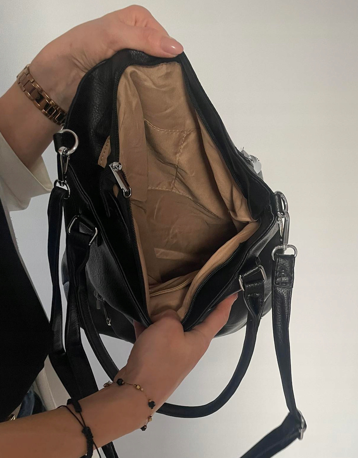 Основне відділення сумки закривається на блискавку. Всередині відділення на блискавці, дві відкриті кишені і кишеня на блискавці. Ззаду сумки є кишеня на блискавці. Спереду також є кишеня на блискавці та кишеня, що закривається на магніт.