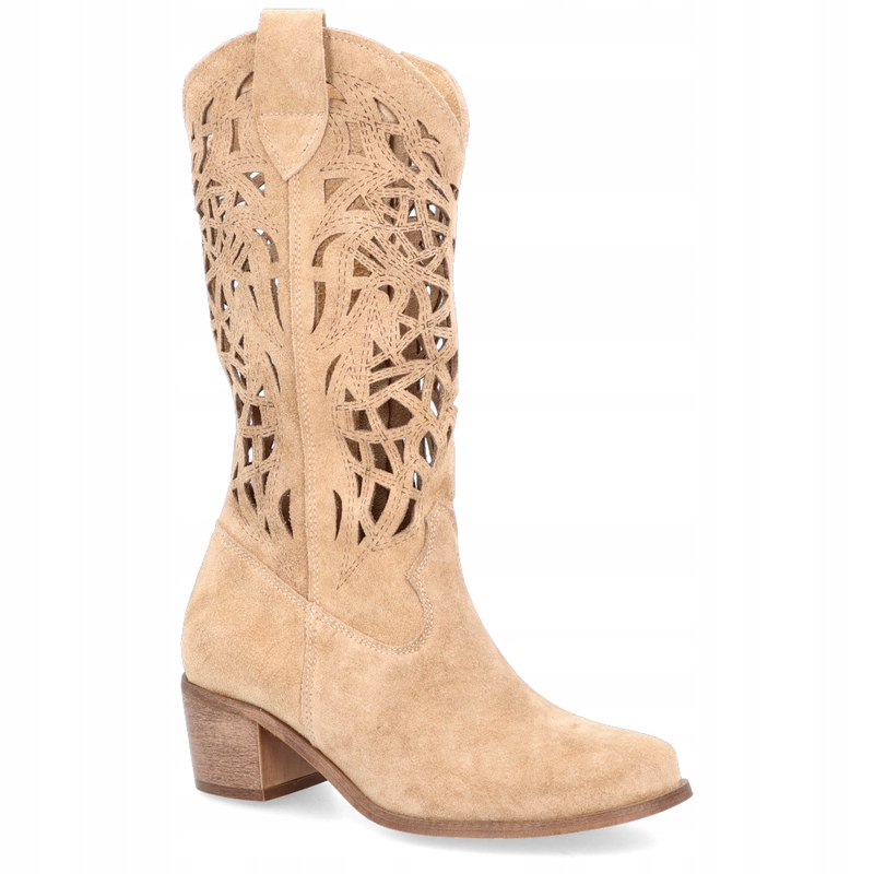 Верх взуття виготовлений з м'якої натуральної замші модного бежевого відтінку. Верх середньої висоти робить взуття ідеальним для теплих днів, а в поєднанні з повітряною сукнею виглядає надзвичайно ефектно на засмаглих ногах. Ажурні ковбойські чоботи - вони додадуть характеру вашому стилю! У цьому сезоні покупці часто вибирають чоботи з верхом середньої висоти. Вони забезпечують хорошу вентиляцію і чудово виглядають на ногах. Всередині взуття оброблено зручною натуральною шкірою, яка ідеально підходить для літніх днів.