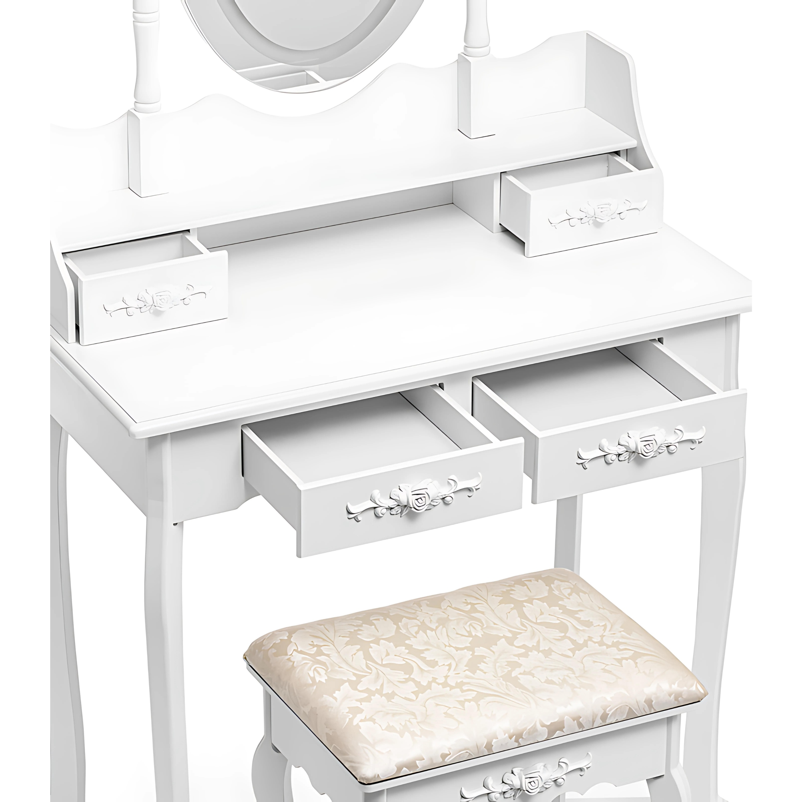 Туалетний столик має 4 практичних висувних ящика, в які можна помістити як дрібні предмети, так і великі засоби для укладання. На стільниці розміщені два ящики, з'єднані практичною поличкою по всій довжині туалетного столика. Ще два більших висувних ящика розташовані у верхній частині туалетного столика. Всі вони мають зручні ручки у вигляді квіточок.