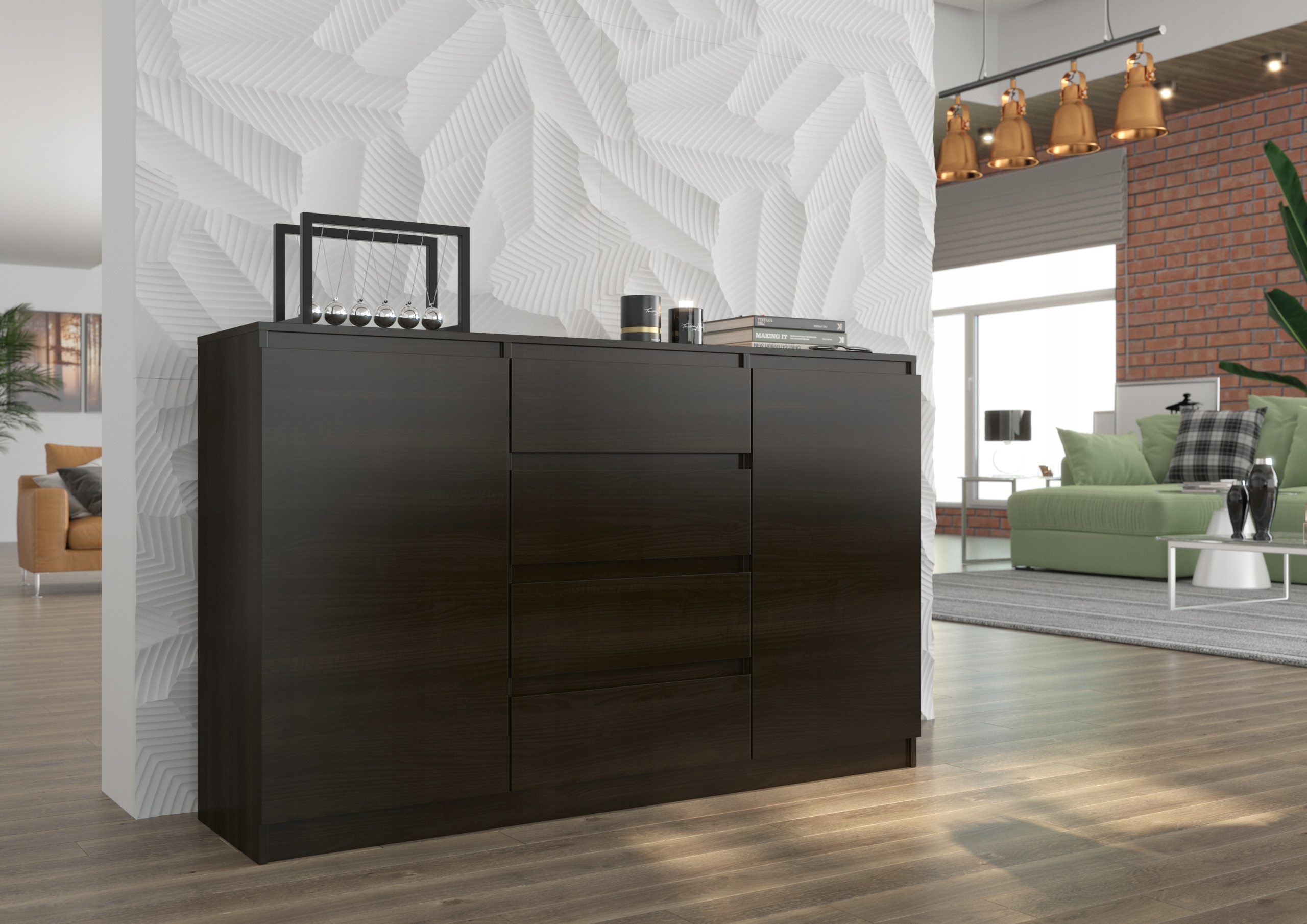 Стильний комод з колекції MODERN, створений для людей, які цінують сучасний стиль і елегантність. Оновить інтер'єр кожної спальні та вітальні. Дизайн мінімалістичний, але надійний і міцний. Завдяки фасадам ящиків без ручок, комод зручний у використанні. Ергономічні розміри комода надають свободу в облаштуванні кімнати.