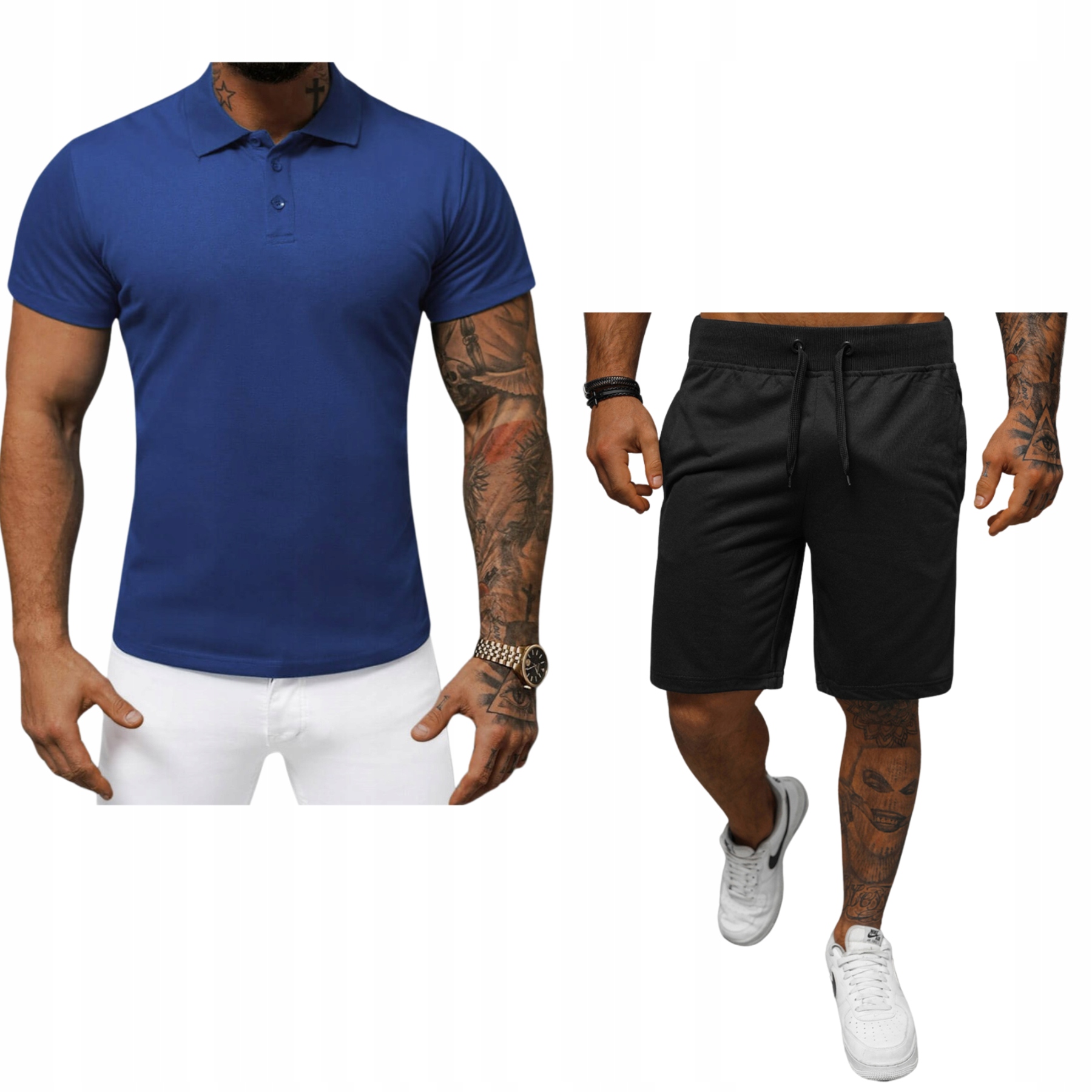 Цей елегантний набір складається з блакитної сорочки поло та чорних потрясових шортів, створюючи універсальний та зручний набір для кожного випадку. Сорочка поло, виготовлена з м'якого бавовни та поліестеру, ідеально поєднує комфорт і силу. Класичний виріз з кнопкою, кріпленою коміром, надає T -сорочці вишуканий вигляд, ідеально узгоджуючись з різними стилізацією. Пот -Міксування бавовни та поліестеру забезпечує свободу руху та комфорт носіння. Завдяки гнучкому ремені з регульованою струною, шорти ідеально адаптуються до кожної фігури. Два бічні кишені додають практичності, і весь набір створює модний і в той же час функціональний набір для різних випадків.