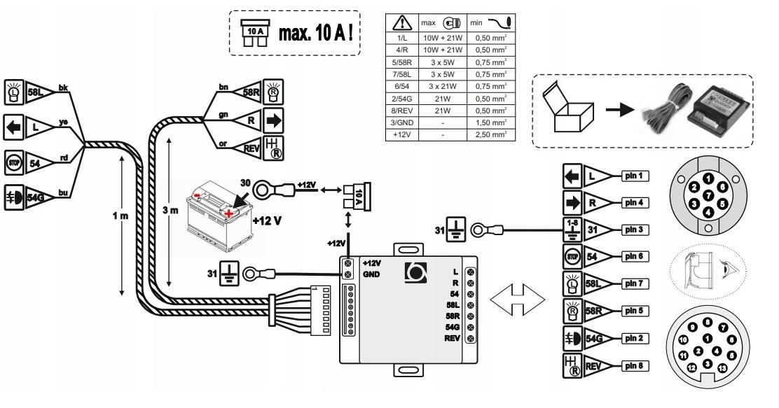 Модуль розроблено для підключення 8-провідної установки причепа (тобто з ліхтарем заднього ходу) і має використовуватися з 13-контактною розеткою, але може використовуватися з 7-контактна розетка (тоді без підтримки ліхтаря заднього ходу).