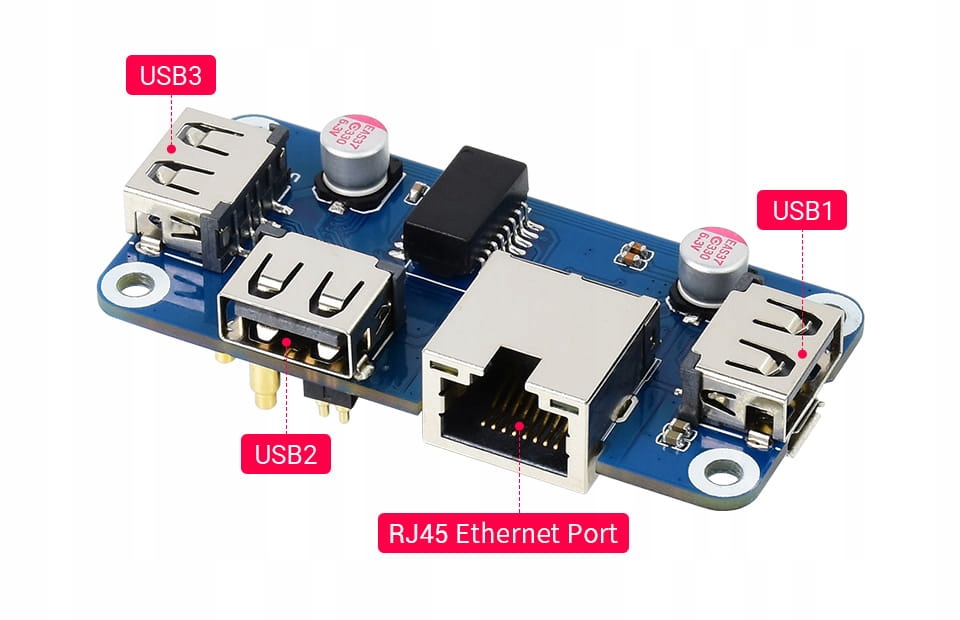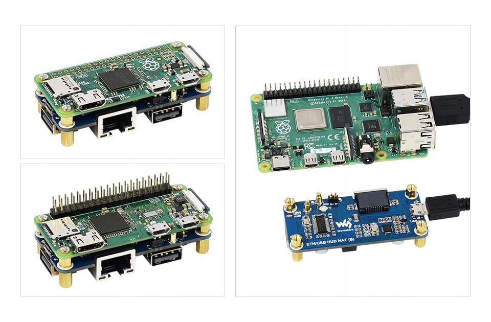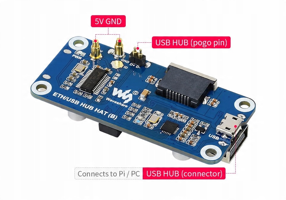 ⭐ ETH/USB HUB HAT (B) — це 3-портовий USB-ХАБ, що містить один порт RJ45, призначений для Raspberry Pi. Його дизайн Pogo Pin спеціалізований для серії Zero, тоді як вбудований звичайний USB-роз’єм можна використовувати для підключення до інших плат Raspberry Pi або ПК через USB-кабель.
