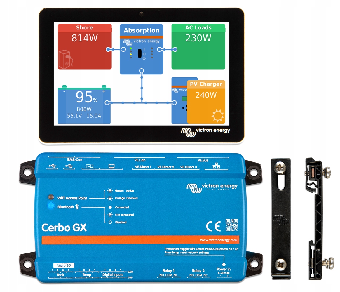 Cerbo GX уже настільки оптимізовано, що не лише відповідає вимогам професійних інсталяторів, але й встановлює нові стандарти. Пристрій можна легко встановити на DIN-рейку (за допомогою маленького адаптера DIN35, не входить у комплект), а його окремий сенсорний екран можна прикріпити до панелі приладів за допомогою гвинтів без необхідності точного вирізання отворів (як у випадку з Color Control GX). ). Підключення здійснюється лише одним кабелем, що дозволяє уникнути підключення багатьох кабелів до плати. Нова функція Bluetooth у цьому пристрої дозволяє швидко підключатися та налаштовувати його за допомогою нашого додатка VictronConnect.