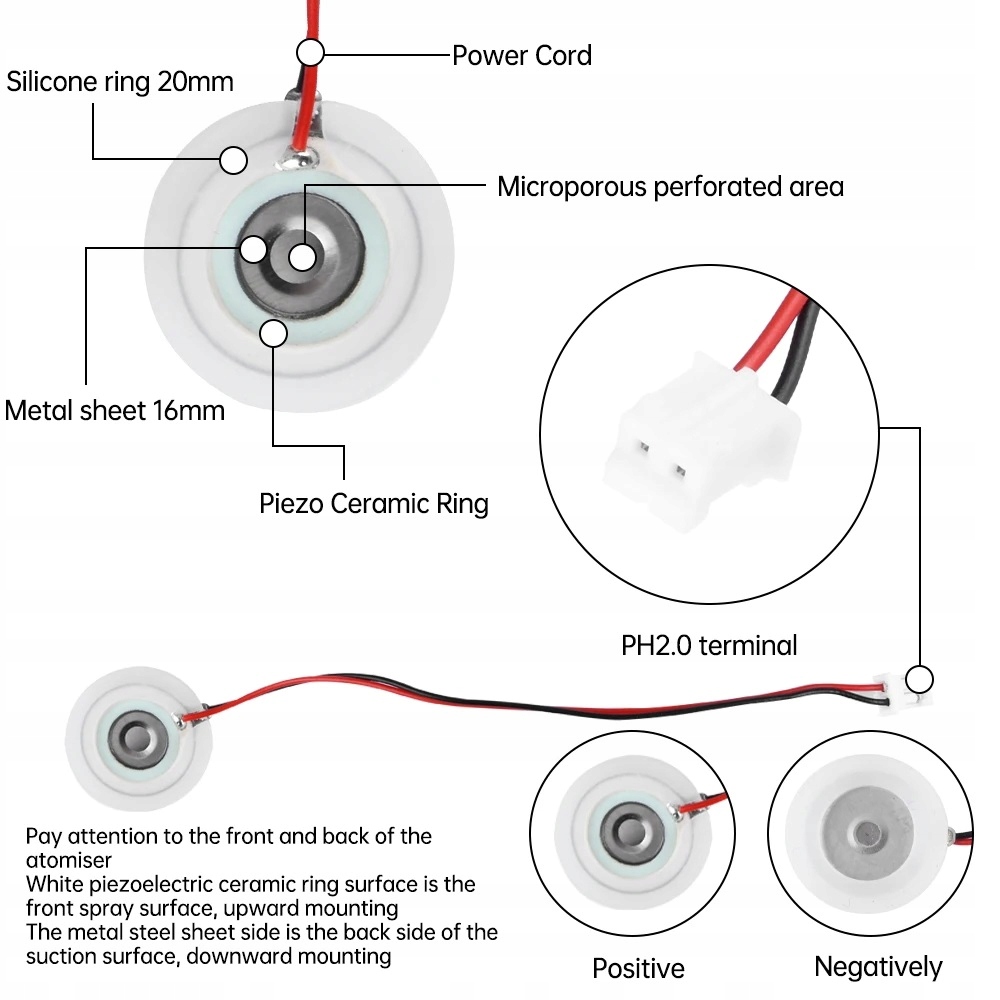 Мікропориста розпилювальна пластина складається з п'єзоелектричного керамічного кільця та сталевого листа. Вихідна імпульсна модуляція ШІМ, керована платою, змушує п’єзоелектричну кераміку виробляти високочастотний резонанс сотні тисяч разів на секунду, спричиняючи вібрацію металевої діафрагми.