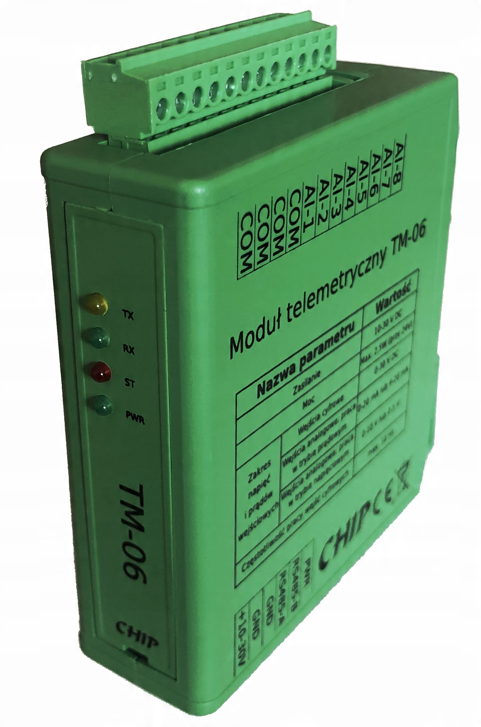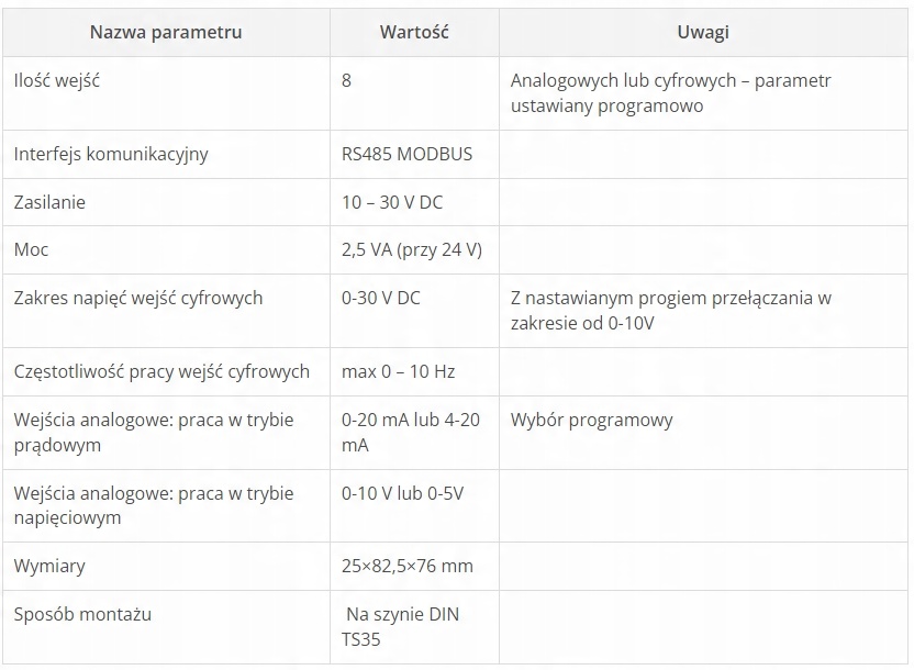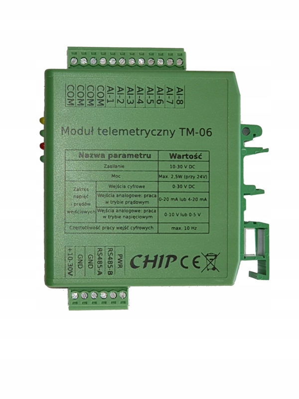 TM-06-це модуль 8 входів сигналу; Кожен з них може працювати як аналоговий або цифровий вхід. Аналогові входи можуть працювати в поточному (0-20 або 4-20 мА) або напрузі (0-5 або 0-10 В). Цифрові входи приймають вхідну напругу в діапазоні 0-30 В. Значення напруги, при якому цифровий вхід виявляє високий стан, також налаштовується. TM-06 може працювати в системах M2M, співпрацювати з системами SCADA, контролерами PLC, іншими пристроями, що використовують протокол Modbus RTU. Він може працювати безпосередньо з панелями HMI