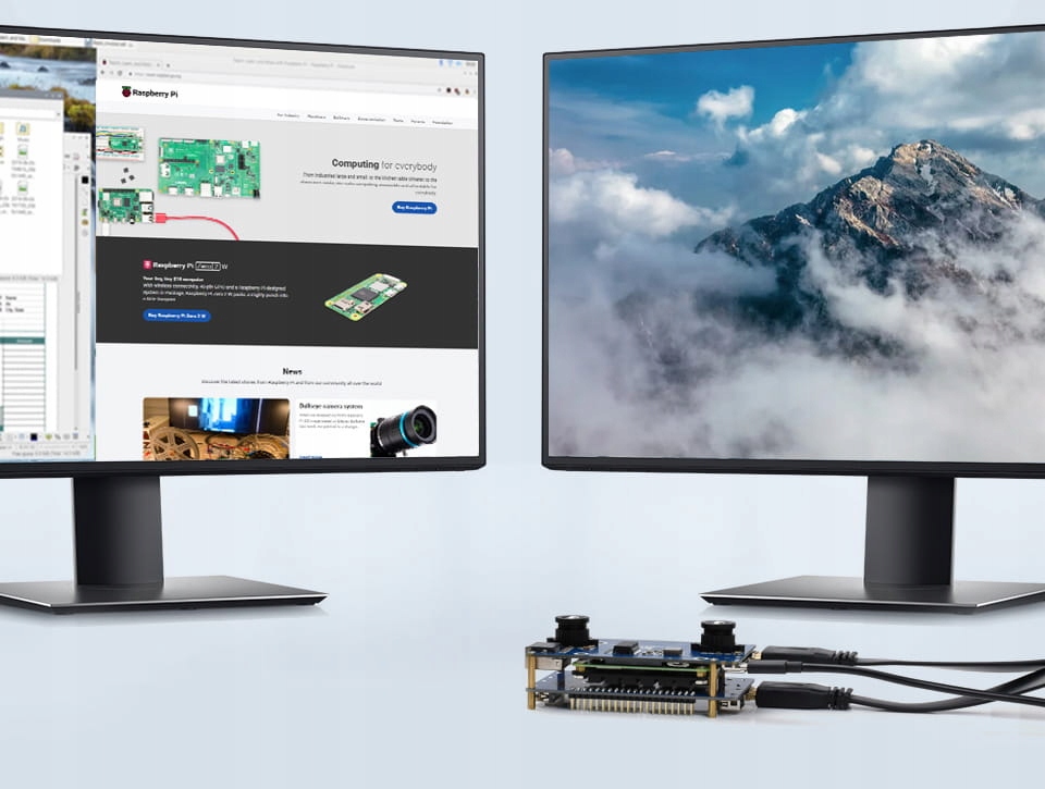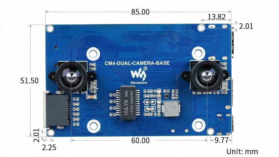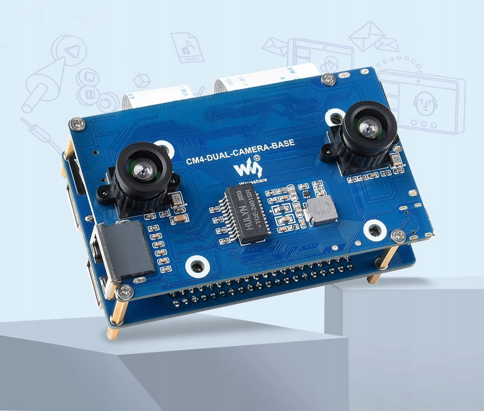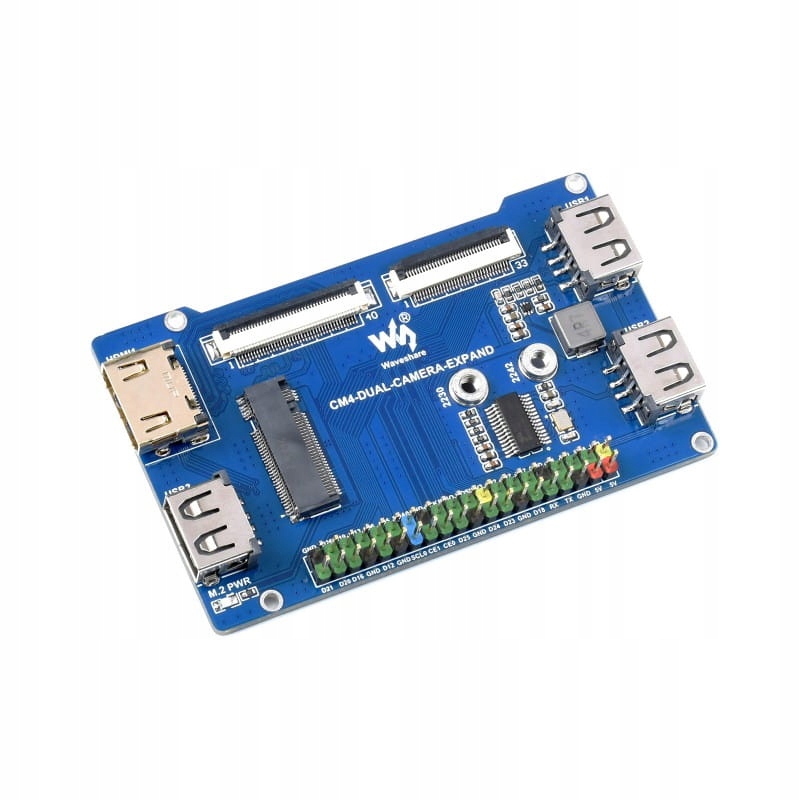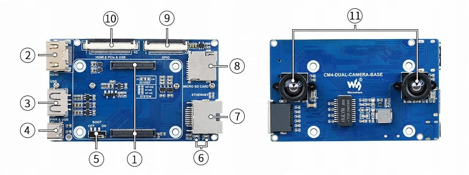 Набір із платою Dual Camera Base та розширювачем інтерфейсу, призначеним для модулів Raspberry Pi CM4, оснащений спеціальними роз’ємами, що дозволяють підключити модуль CM4, дві камери з датчиком IMX219 з роздільною здатністю 8 МП та контакти для базової інтерфейси, включаючи роз'єм USB, Ethernet, HDMI і слот для карт microSD. Крім того, є два роз'єми FFC з інтерфейсами USB 2.0, PCIe, HDMI і GPIO. Вони використовуються для підключення RPi CM4 до розширювача інтерфейсу.
