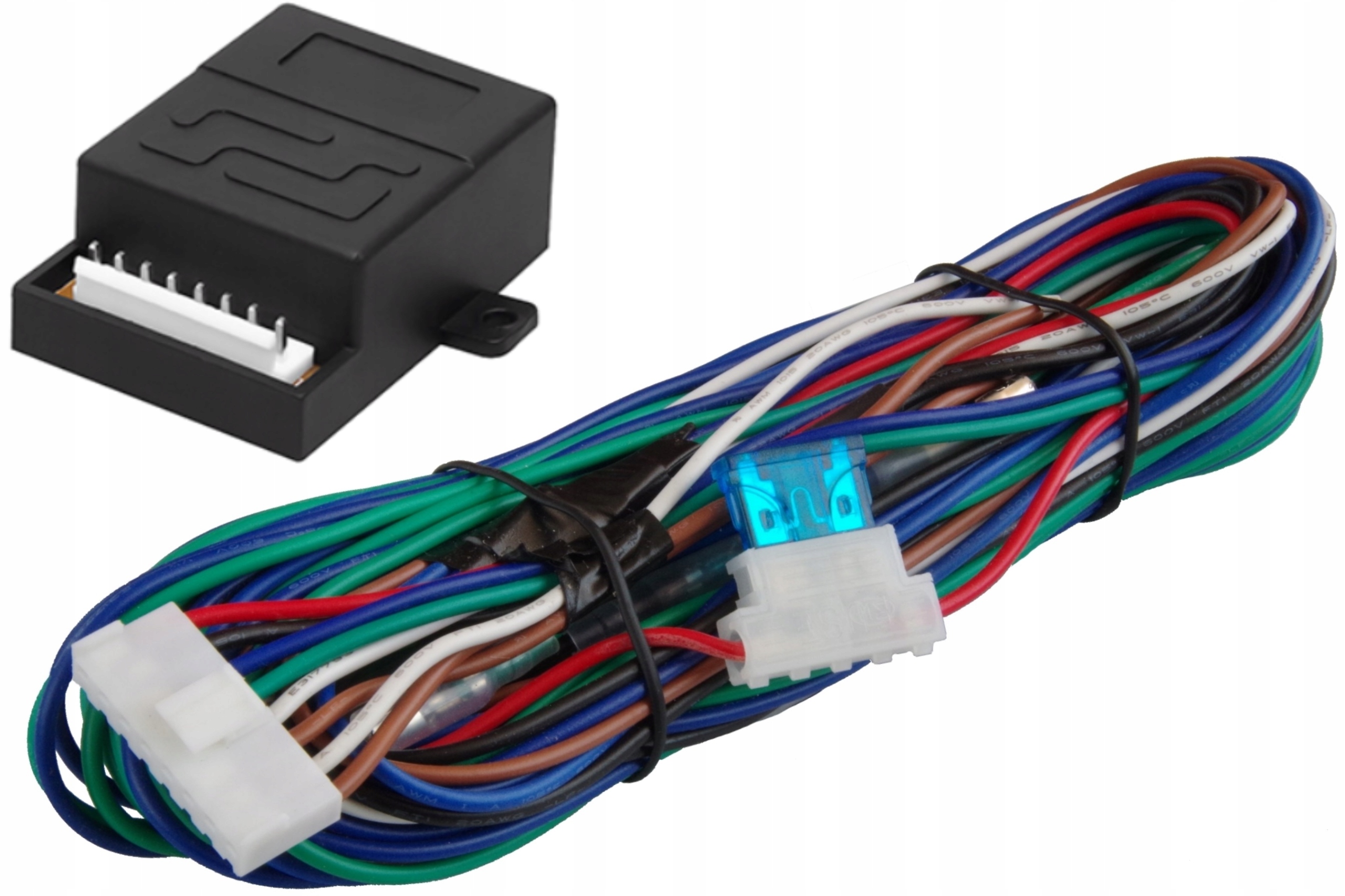 Універсальний модуль центрального замка та відповідний 4-дверний джгут проводів із запобіжником 10 A. Джгут дозволяє підключати 3 ведені приводи та 1 головний привод. Пристрій дозволяє керувати приводами SLAVE (2 дроти) за допомогою приводу MASTER (5 проводів), але також має додатковий вхід (2 x земля) для спрацьовування від сигналізації, контролера замка або кнопки. Кожен набір буде супроводжуватися схемою складання.