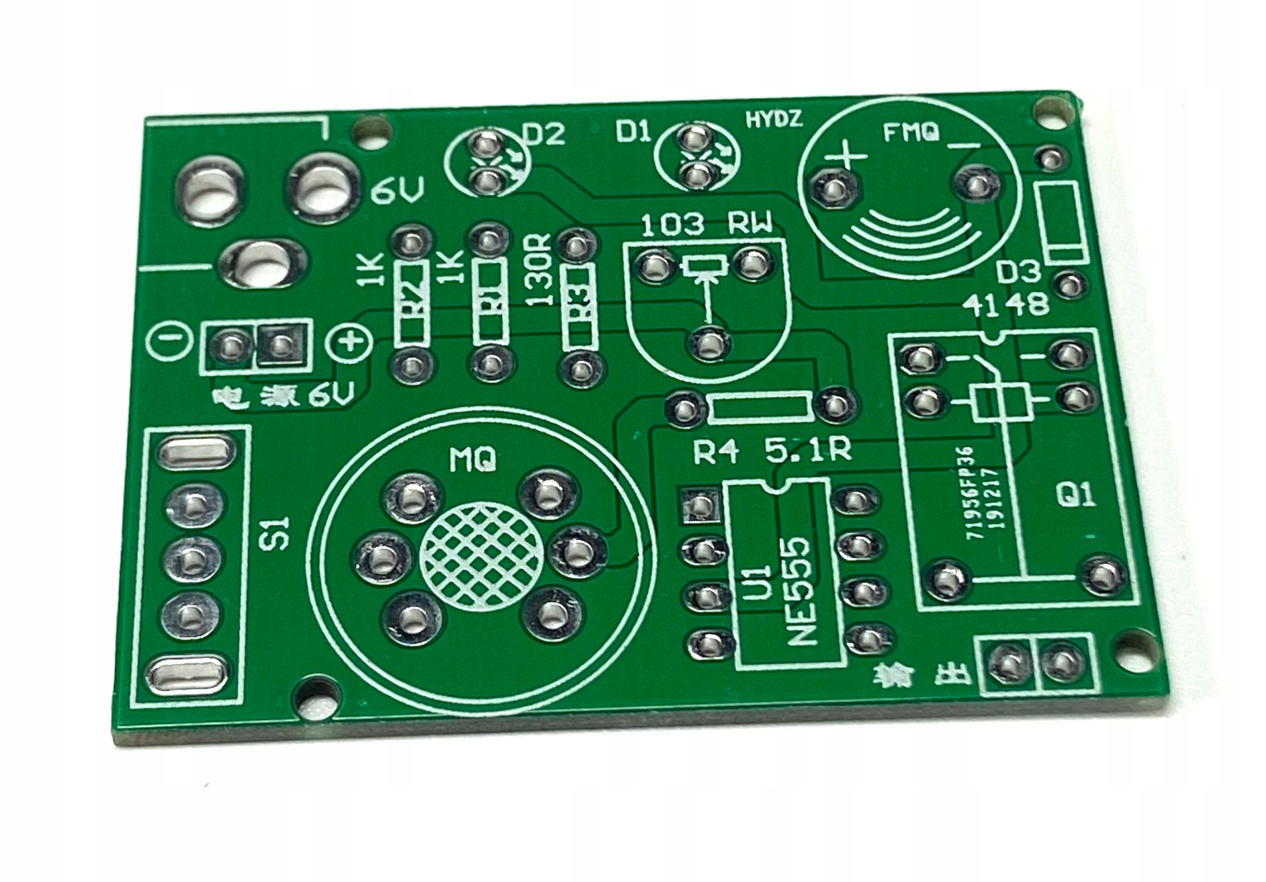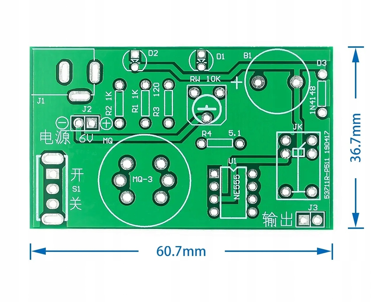 Перемикач живлення S1, резистор R1 і світлодіод D1 використовуються для індикації вмісту алкоголю в повітрі, під час роботи датчик mq-3 потрібно нагріти до певної температури, тому всередині є провід опору для нагрівання, резистор R4 обмежує опір нагрівального дроту електричний. Коли mq-3 не виявляє пари спирту, його внутрішній опір дуже великий, падіння напруги на R3, RW дуже низьке, напруга на 2-контактному контакті NE555 нижча за напругу запуску (VCC/3), його 3-контактний має вихід високого рівня, діод D2, зумер і реле не працюють. Коли mq-3 виявляє пари спирту, внутрішній опір зменшується, напруга R3 і RW зростає, напруга на контакті 2 NE555 вища за напругу запуску, напруга на контакті 3 нижча, D2 світиться, зумер дає сигнал, і на електромагнітну котушку в реле подається напруга, і реле вмикається. Для регулювання чутливості використовується регульований резистор RW. Виходи 7 і 5 на NE555 не використовуються. Вихід реле J3 можна використовувати для керування іншими електричними пристроями, такими як витяжний вентилятор (не входить у комплект). Коли концентрація спирту перевищує норму, включається витяжний вентилятор. Коли концентрація падає, витяжний вентилятор вимикається для автоматичного керування. Діод D3 використовується для усунення індуктивної електрорушійної сили, яка виникає під час увімкнення та вимикання котушки реле.
