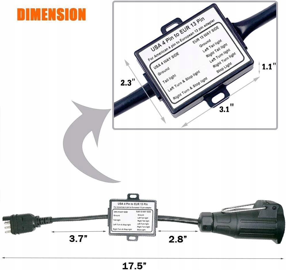 2. Якщо ваш автомобіль у США має 4-контактний плоский роз’єм, а ваш європейський причіп має 13-контактний круглий штекер, де ваш автомобіль у США потребує відокремлення стоп-сигналів від заднього сигналу, будь ласка, використовуйте цей адаптер проводки для причепа.