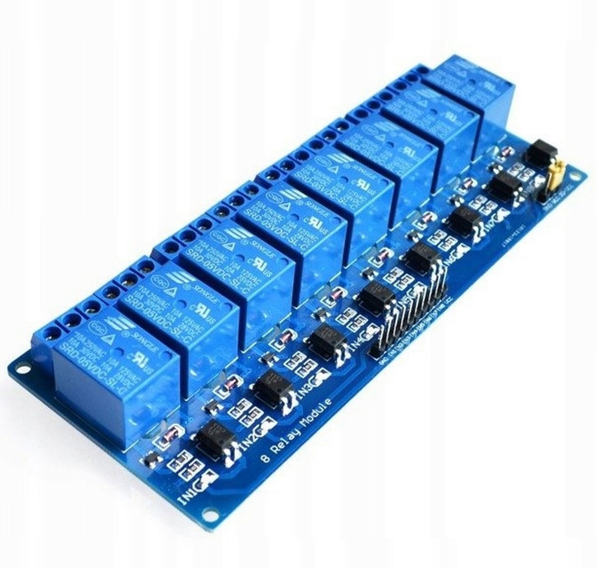 8-канальний релейний модуль, яким можна керувати за допомогою мікроконтролера, напр. Arduino. Модуль оснащений світлодіодами, які вказують на роботу конкретного реле.