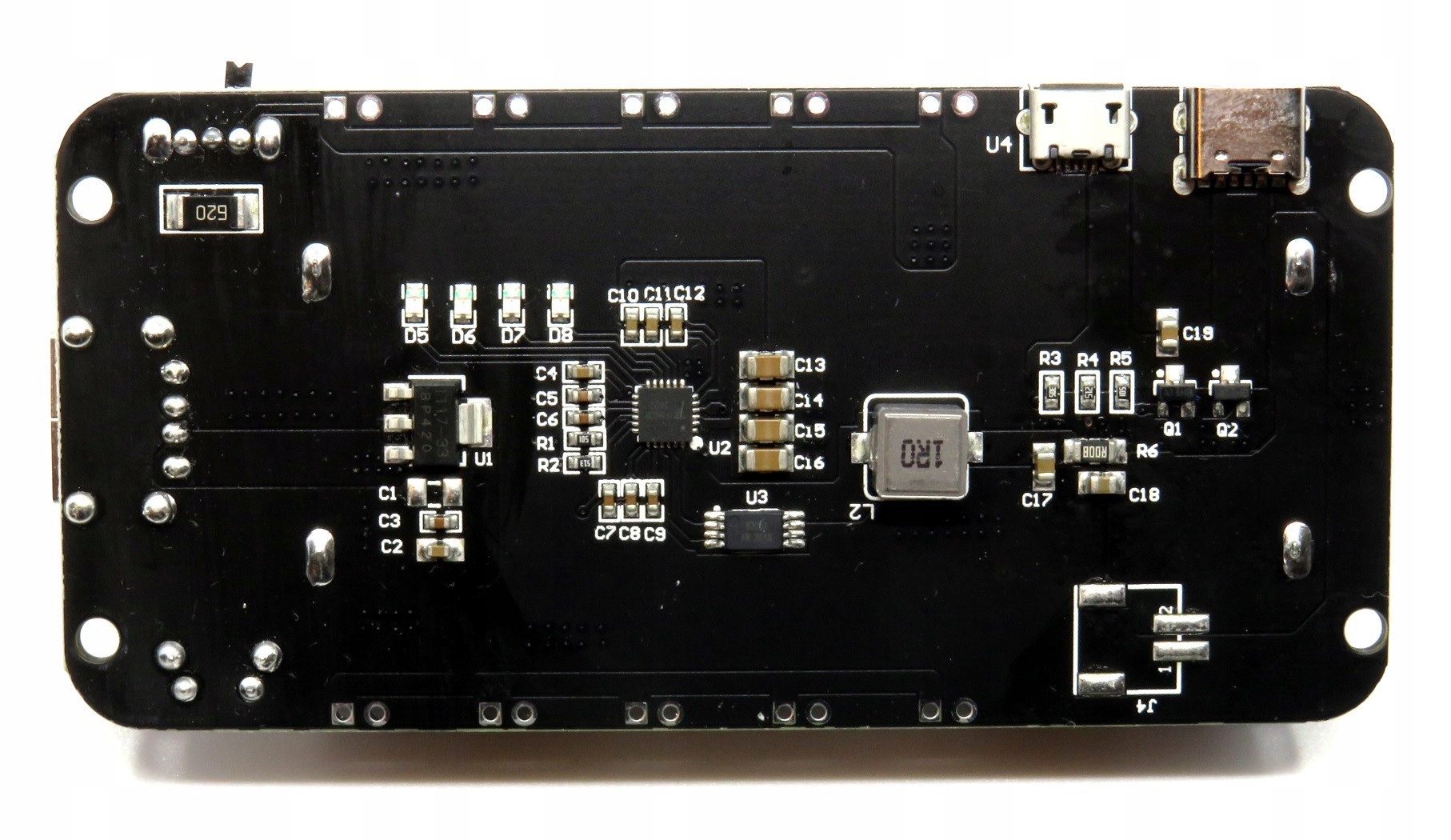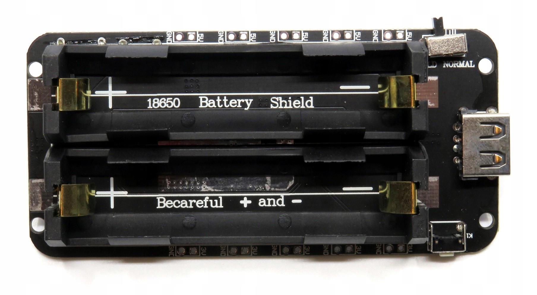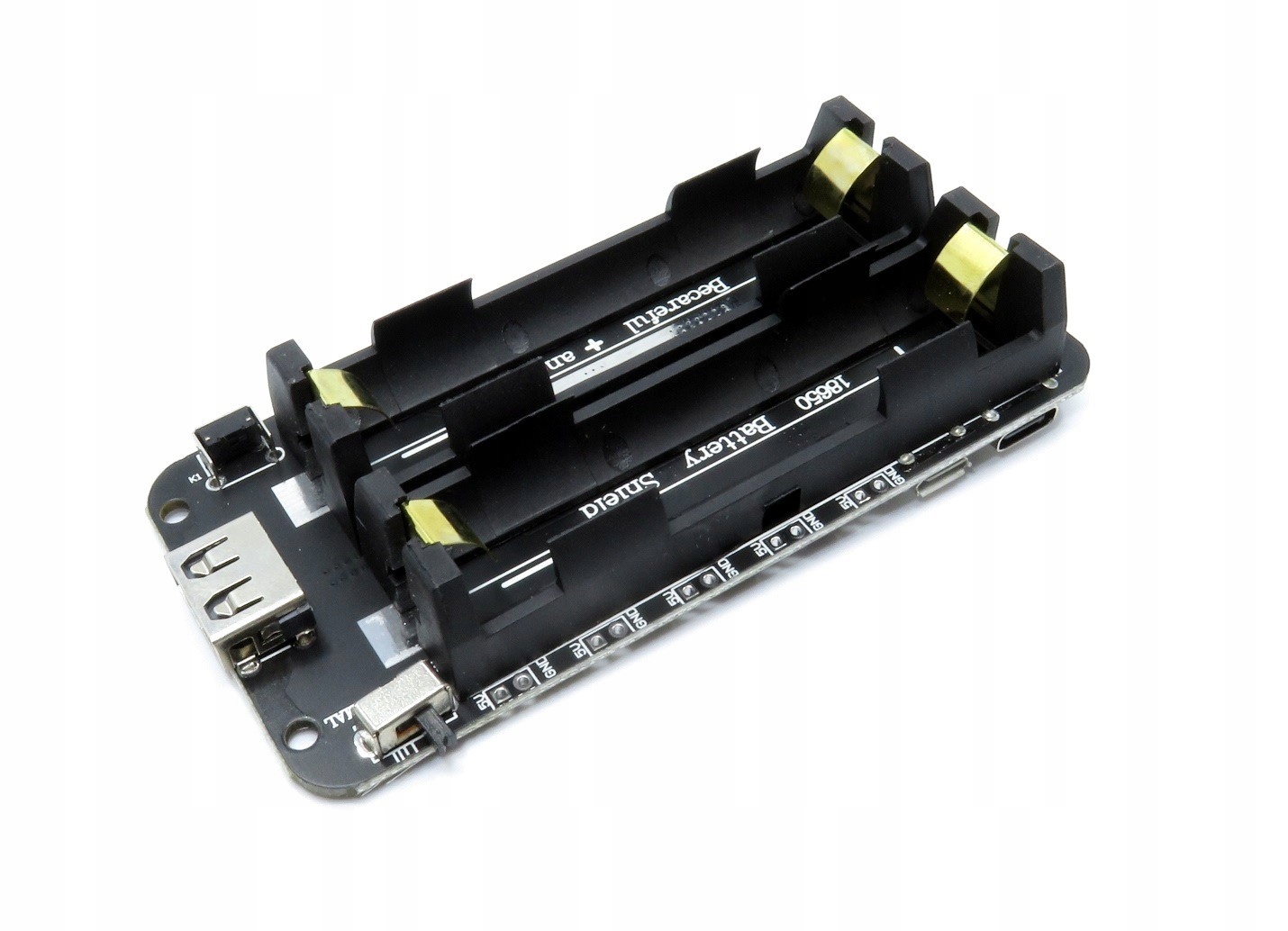 Модуль Power Bank з кошиком для двох батарей 18650. Зарядка відбувається через роз'єм micro USB або USB type C з максимальним струмом до 800 мА. Пристрій може забезпечити напругу 3 В і силу струму 1 А (5 комплектів накладок по краях плати) або напругу 5 В і силу струму 2 А (роз'єм USB типу А або 5 комплектів накладок). На платі є перемикач живлення та світлодіодний індикатор стану зарядки. Powerbank можна використовувати як джерело живлення для портативних пристроїв або джерело екстреної зарядки, напр. для телефонів або планшетів.
