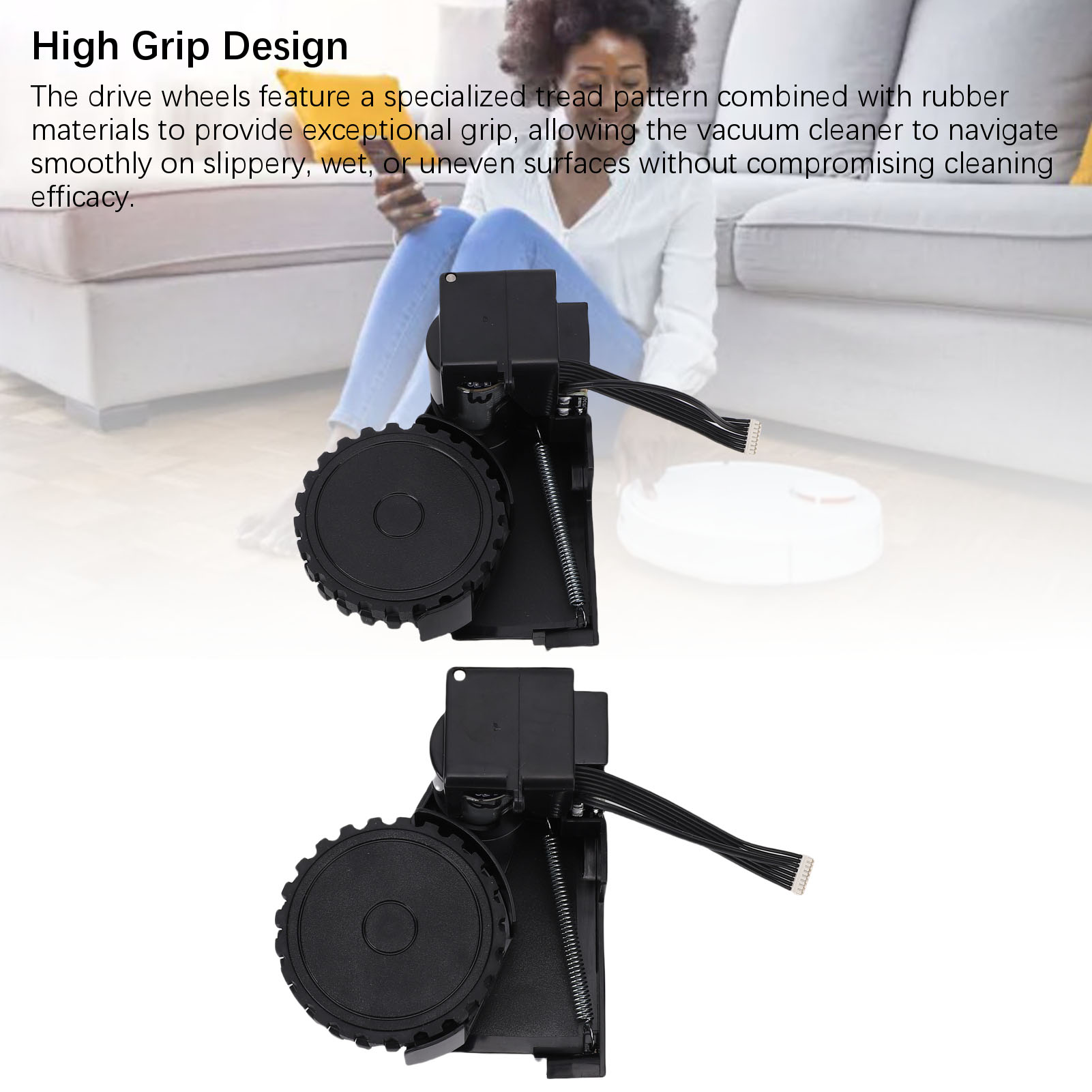 3. Високе зчеплення: ведучі колеса мають спеціальний малюнок протектора в поєднанні з гумовими матеріалами для забезпечення виняткового зчеплення, дозволяючи вакууму переміщатися по слизькій, мокрій або нерівній поверхні без шкоди для ефективності очищення.