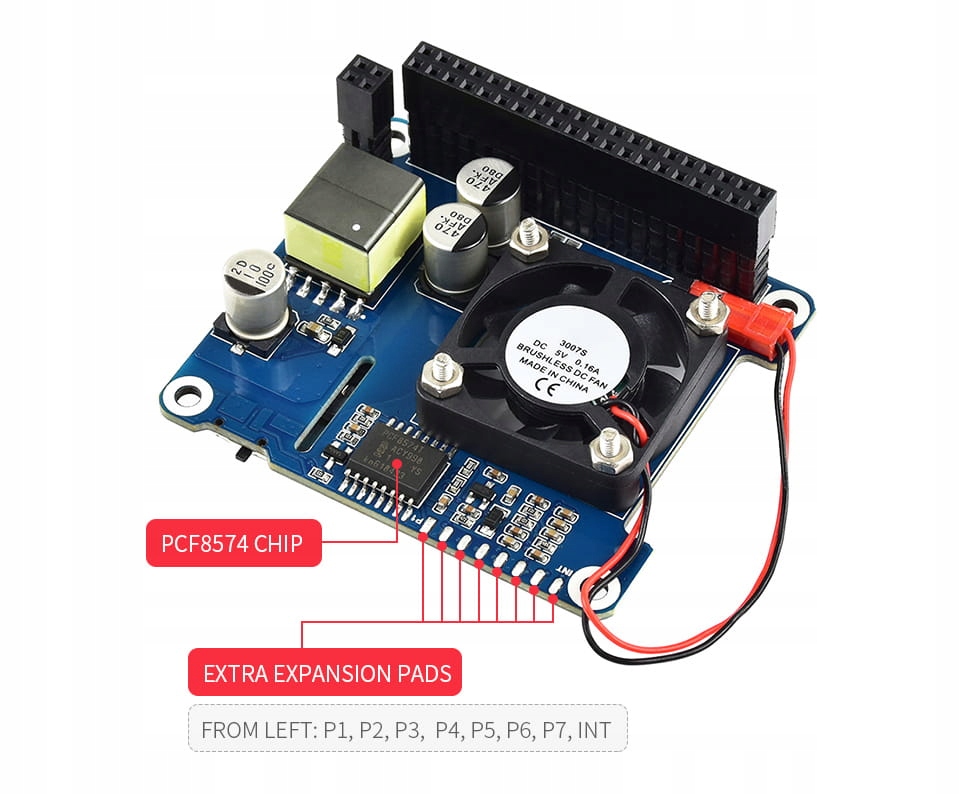 - Інтегрований розширювач ПЧ PCF8574 для шини I2C, що забезпечує контакт P0 для прямого керування вентилятором і додаткові контакти введення/виведення