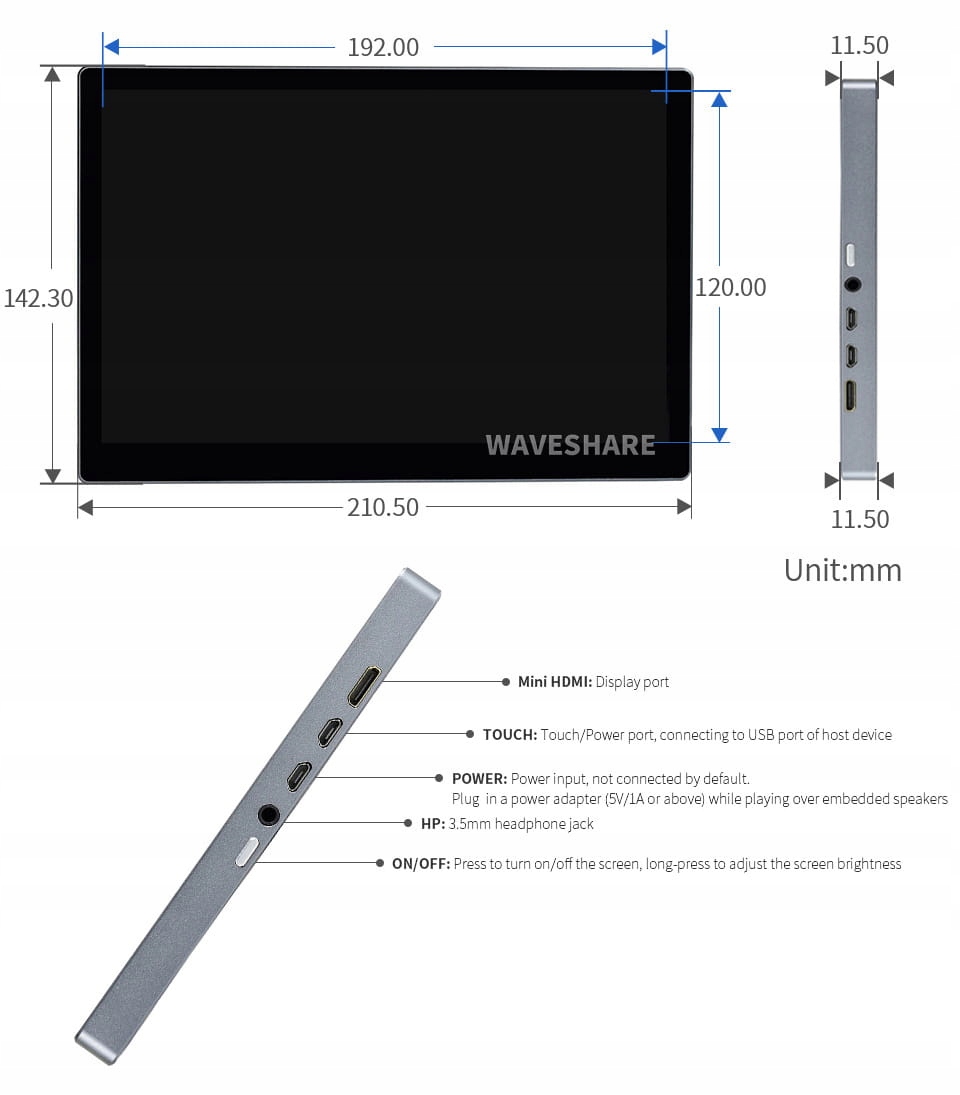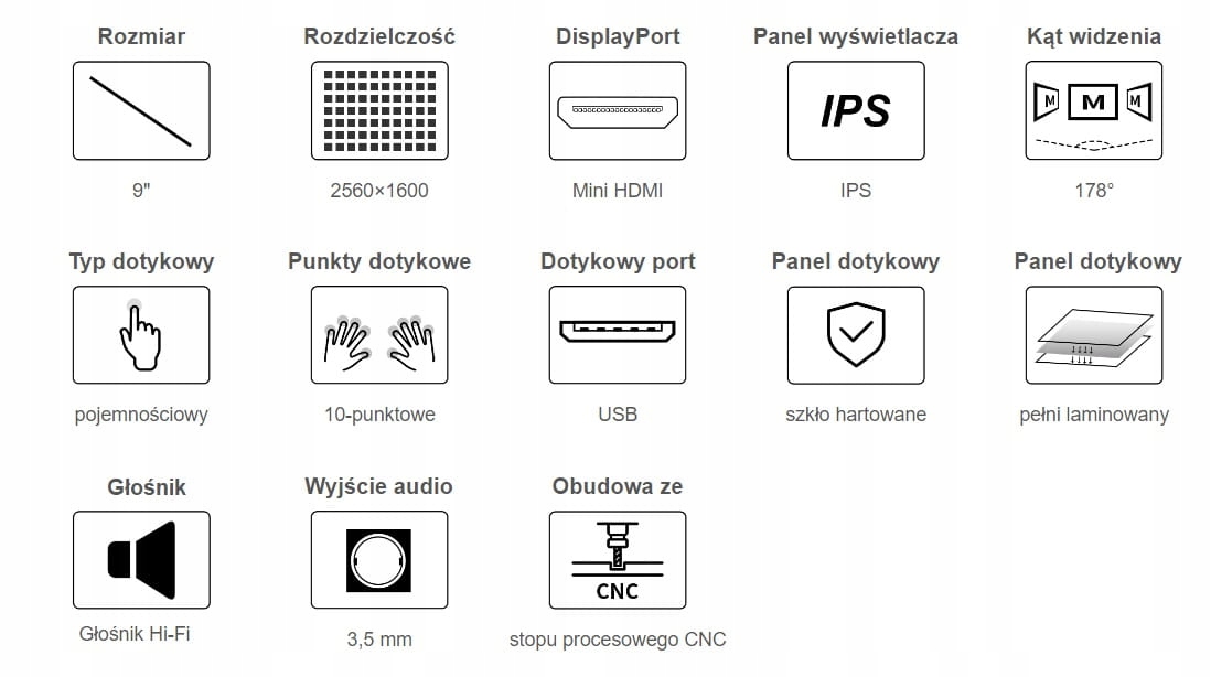 9-дюймовий ємнісний сенсорний монітор з роздільною здатністю 2560×1600 2K, IPS, Mini HDMI, повністю ламінований.