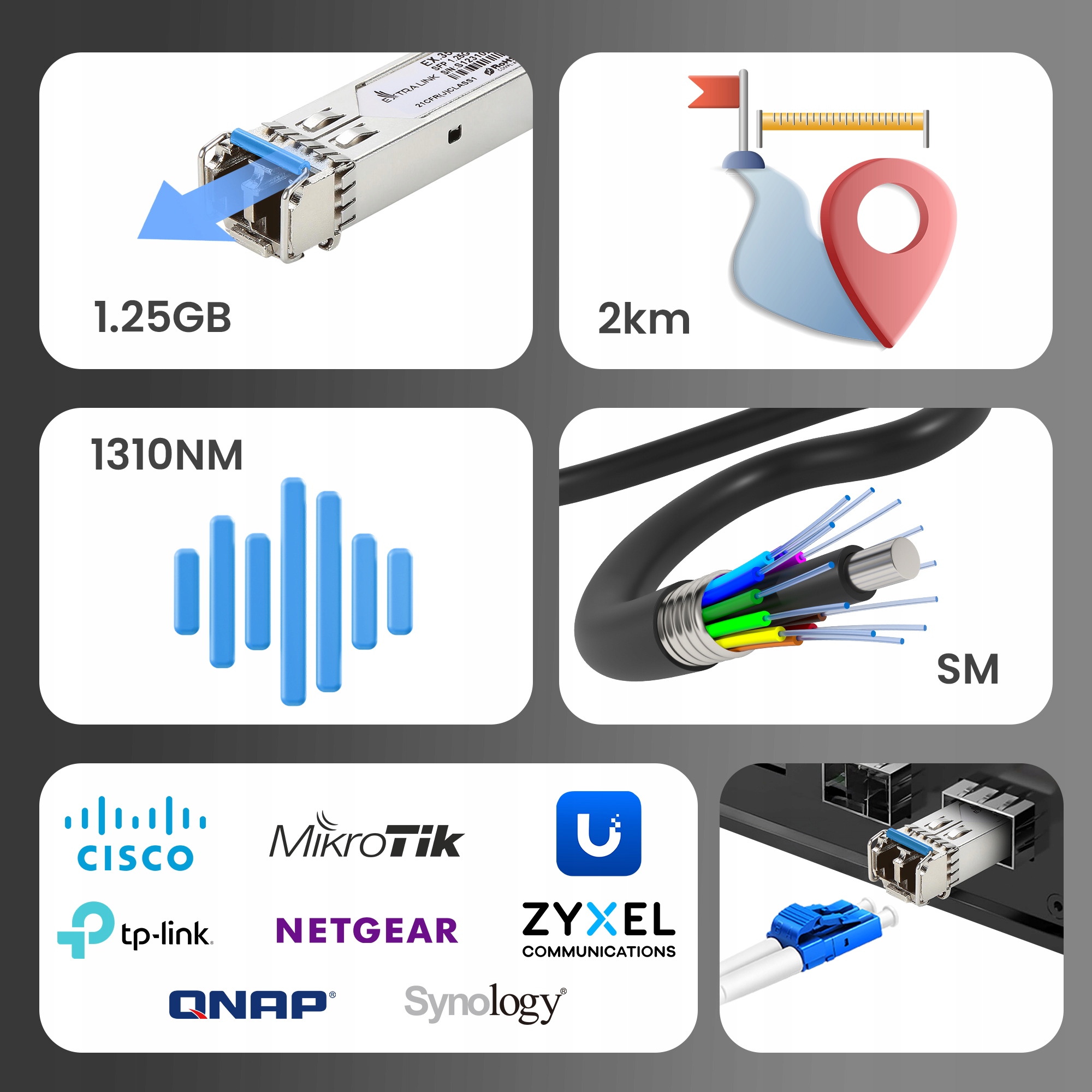 Extralink SFP 1.25G 1310NM відповідає стандарту SONET OC-24-LR-1 і директиві RoHS, що означає, що він відповідає найвищим технологічним і екологічним стандартам. Завдяки вихідному роз’єму LC модуль легко встановити та сумісний із широким діапазоном пристроїв. Пропонуючи повну відповідність широко поширеним стандартам, Extralink SFP забезпечує бездоганну інтеграцію з існуючими мережевими системами.