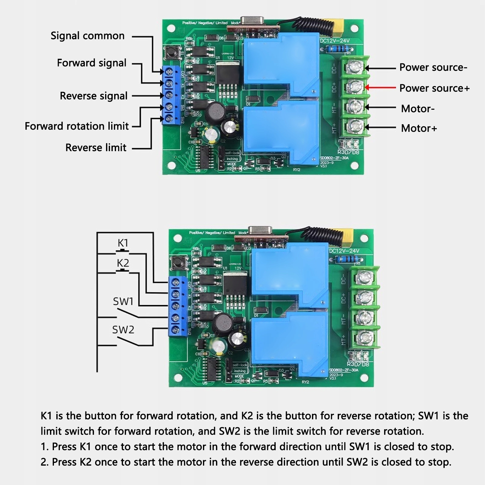 • 1. Натисніть K1 один раз, щоб запустити двигун у прямому напрямку, доки SW1 не закриється та не зупиниться.