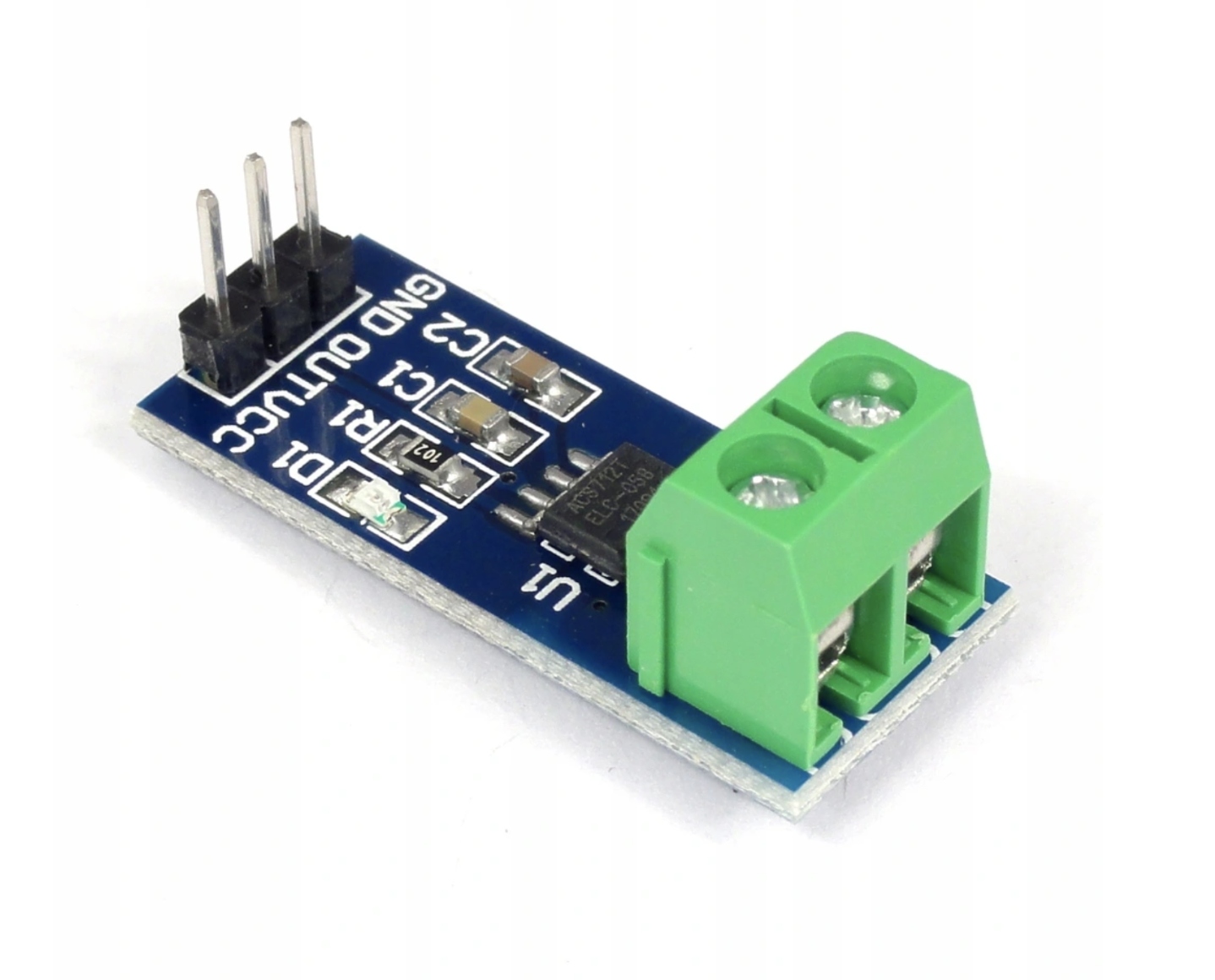 Датчик струму з використанням ефекту Холла для вимірювання. Сила струму вимірюється до 20 А, а його чутливість становить 100 мВ/А