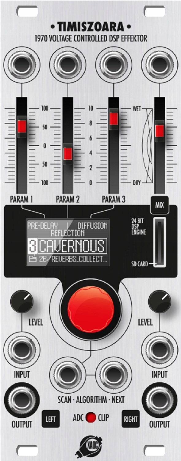 XAOC Timišoara — це стереопроцесор сигналу з кількома ефектами, керований напругою, на основі популярної схеми Spin Semiconductor FV-1 DSP. Він має повний тракт стереосигналу з двома регульованими аудіовходами, двома виходами та мокрим/сухим стерео мікшером з контрольованою напругою. Крім того, на передній панелі є слот для карти пам’яті microSD, який дозволяє завантажувати заводські та спеціальні ефекти без будь-яких обмежень або захисту авторських прав, що означає, що ви можете використовувати кілька попередньо створених ефектів, а також створювати власні. p>