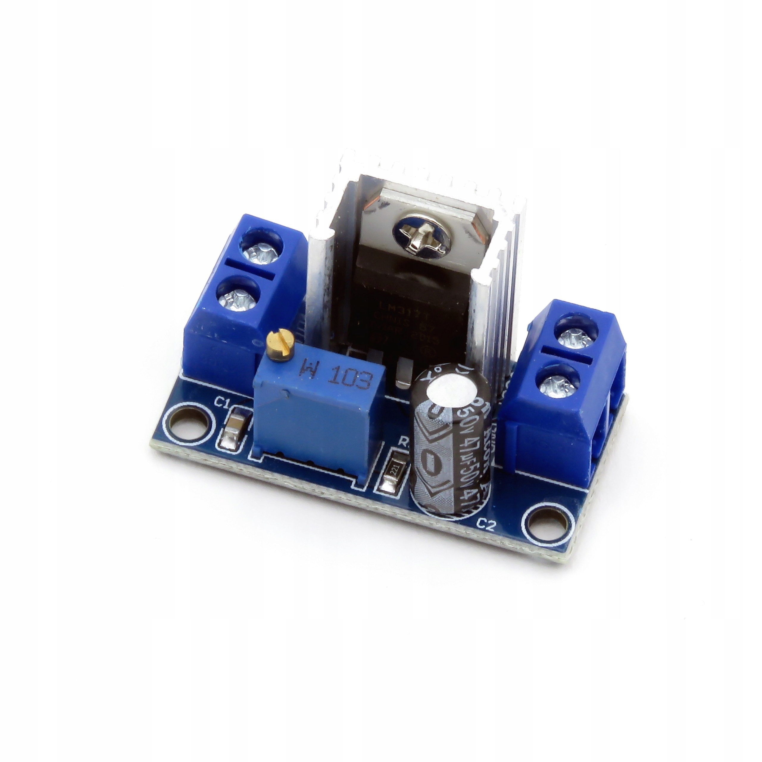 Модуль з регульованим стабілізатором напруги LM317 з вихідною напругою в діапазоні від 1,2 В до 37 В і максимальний струм 1,5 А. Плата оснащена двома гвинтовими роз’ємами для підключення вхідної напруги та пристрою, що живиться, а також потенціометром для регулювання напруги.