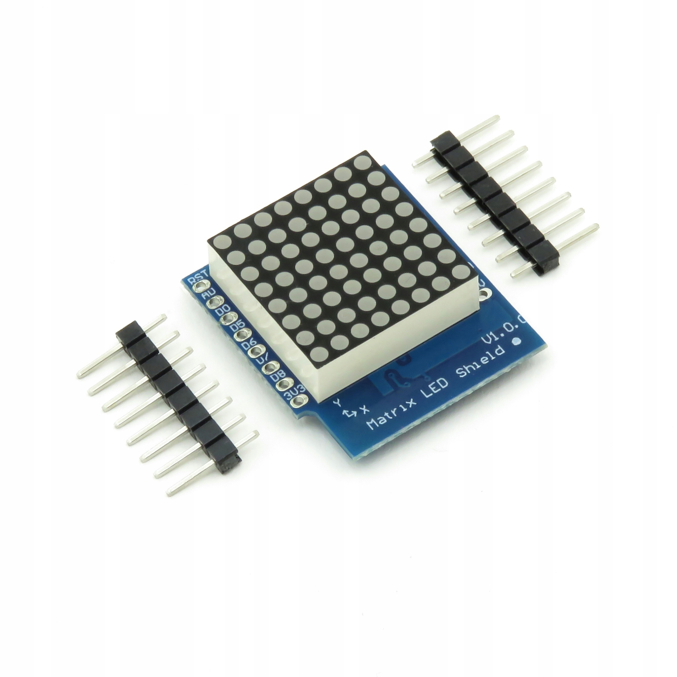 Модуль зі світлодіодною матрицею 8x8 для плат Wemos D1 Mini. Він оснащений світлодіодним драйвером AIP1640 і спілкується через інтерфейс I2C. Його живить 3,3 В. Його можна використовувати як дисплей простої графіки, серед іншого, у таких пристроях, як лічильники, годинники та лічильники.