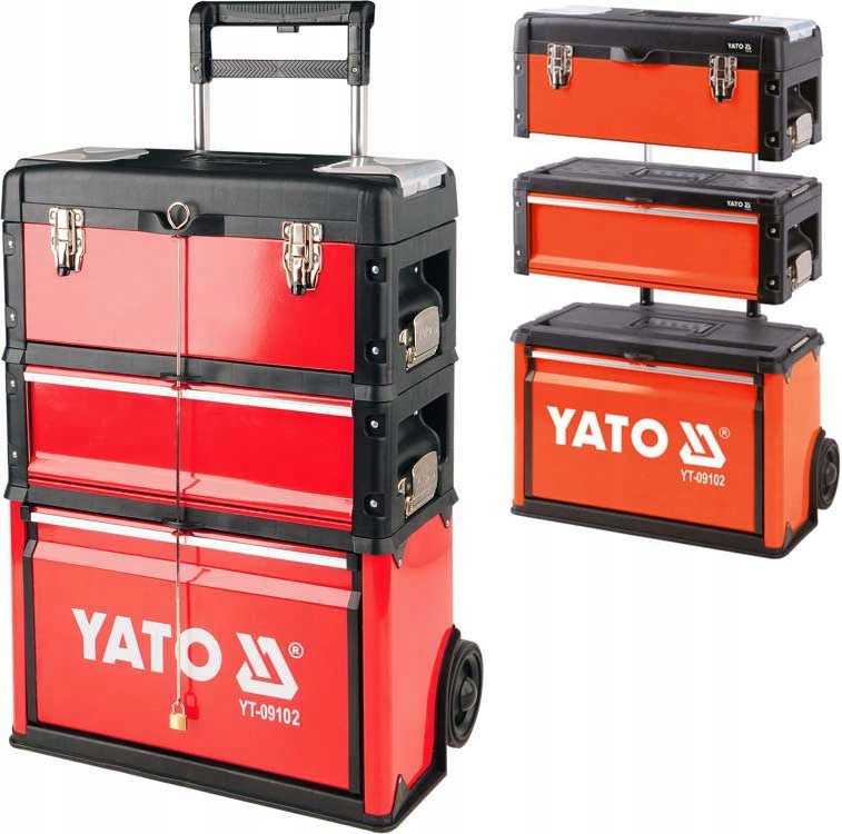 Можна розширити набір із 3 модулів до набору з 4 модулів, додавши середній модуль YT-09107 або YT-09108. Верхній і середній модулі мають металеві кріплення для об'єднання в комплекти, а алюмінієва ручка додатково має замок для фіксації модулів. Підноси для інструментів YATO з готовими наборами інструментів можна розмістити в ящиках.