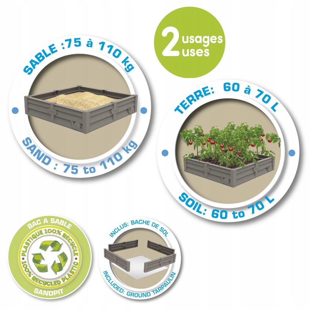 Квадратну пісочницю та клумбу в одному дуже легко встановити та зібрати. Його можна розмістити на рівній поверхні в будь-якому місці. Ідеально підходить для всіх будиночків і садових меблів Smoby!