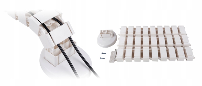 Застібні блоки з’єднуються зі сталевою основою діаметром 5,08 дюйма. Кабельнаправляюча оснащена верхнім гачком для закручування під верхню поверхню стільниці. У нас є можливість регулювати довжину шляхом додавання/видалення блоків.