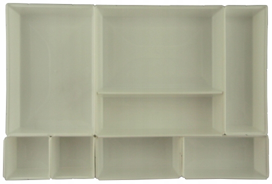 Ми пропонуємо вам практичний модульний організатор для ящика, що складається з 8 елементів, які можна легко поєднувати в різних комбінаціях. Приклади систем показані на малюнках. Додаткові елементи, доступні на інших наших аукціонах !!! 15,5 см завдовжки, завширшки 8 см 5,5 см