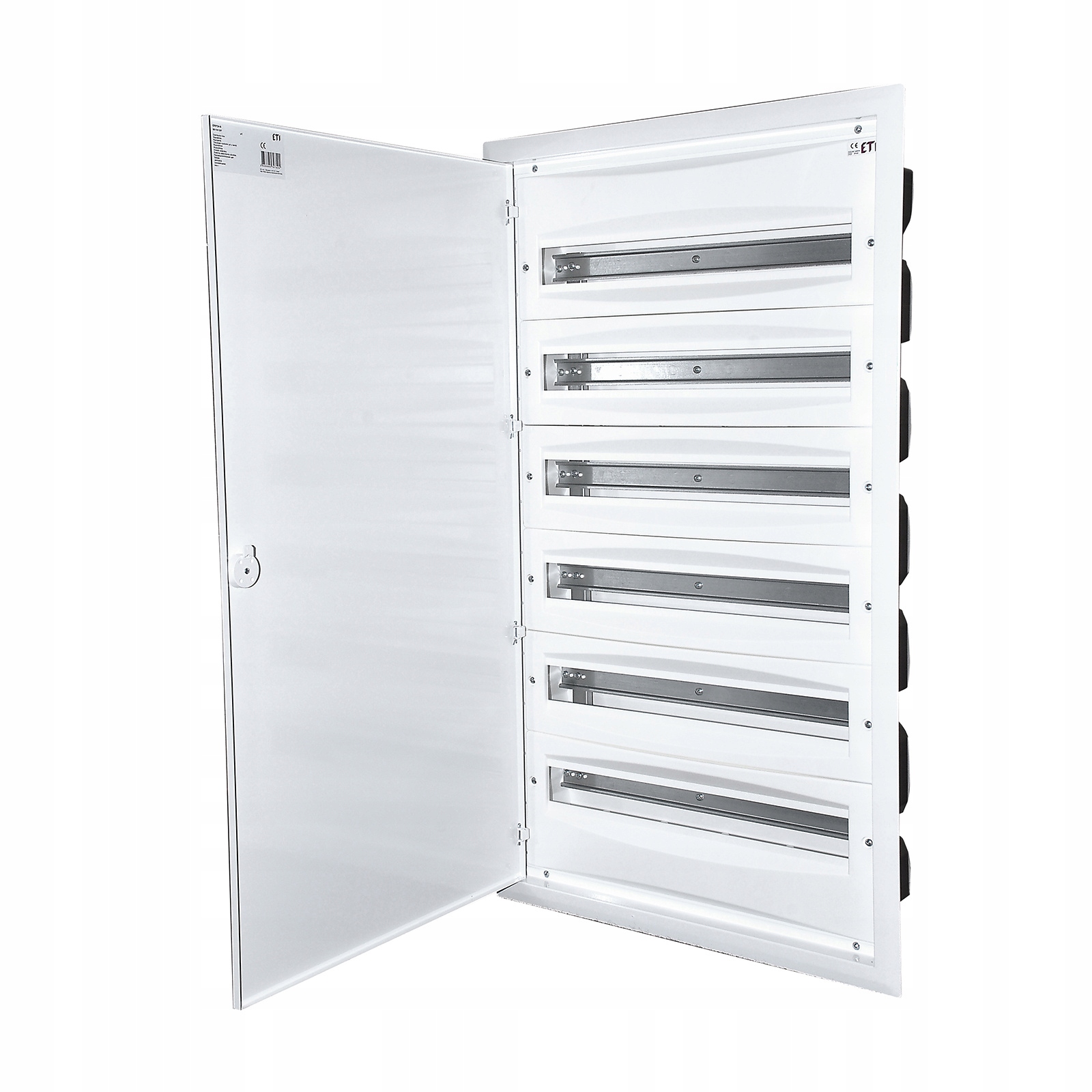 Модульний розподільний пристрій потужністю 144 модулів (6 рядів на 24), адаптований для роботи в 400 В установах, 100 А. Він має металеві двері та білий корпус, виготовлений з довговічного матеріалу, забезпечуючи безпеку та міцність. Відповідає стандартам захисту IP40 та захисним класом II.