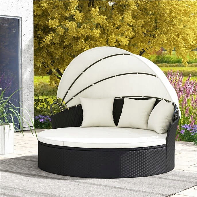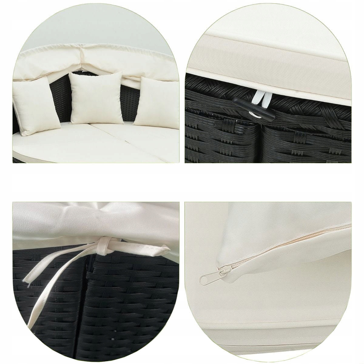 4 Він виготовлений із стійкої до сонця та водної тканини, що забезпечує високу міцність. Спеціальна структура навісу достатньо підкріплює її до дивана.тривале використання зовні: Весь круглий диван виготовлений з високоякісної чорної ротанги ПЕ, яка ретельно сплетена, стійка до вицвітання та надзвичайно довговічної. Крім того, тверда металева рама з регульованими підставками забезпечує високу стабільність та сильну підтримку меблів.
