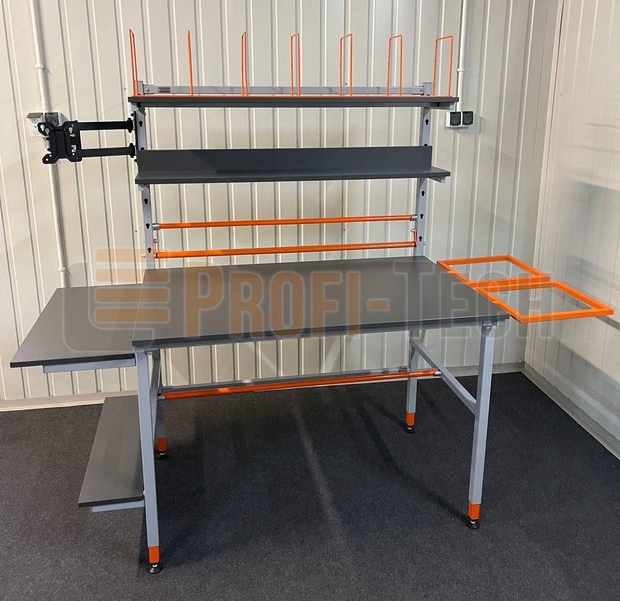 Модульний пакувальний стіл із можливістю дуже легко змінювати положення бокових і передніх полиць без використання будь-яких інструментів.
