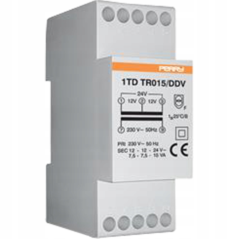Модульний трансформатор потужністю 15 ВА, безперервна робота, первинна напруга 230 В змінного струму, вторинна напруга: 12 - 12 - 24 В, 2 DIN
