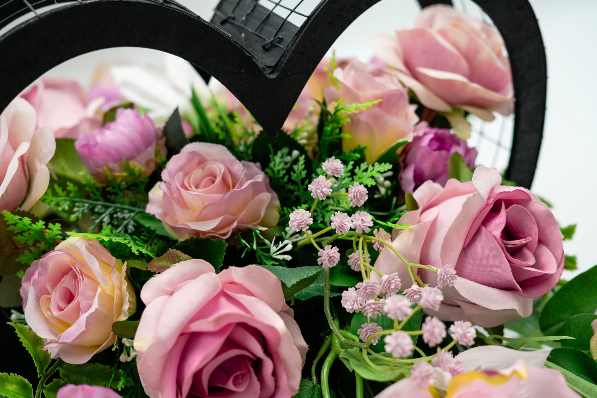Центральним елементом цієї композиції є рожеві троянди , які століттям символізують любов, повагу та вдячність. Їх повні, відкриті бутони переплітаються з тонкими перлами в відтінках фіолетового , і ціле доповнюється білими акцентами , додаючи легкість та гармонію. Все вбудовано на багату, зелену основу з великих листків, які надають композиції природний характер і глибину.