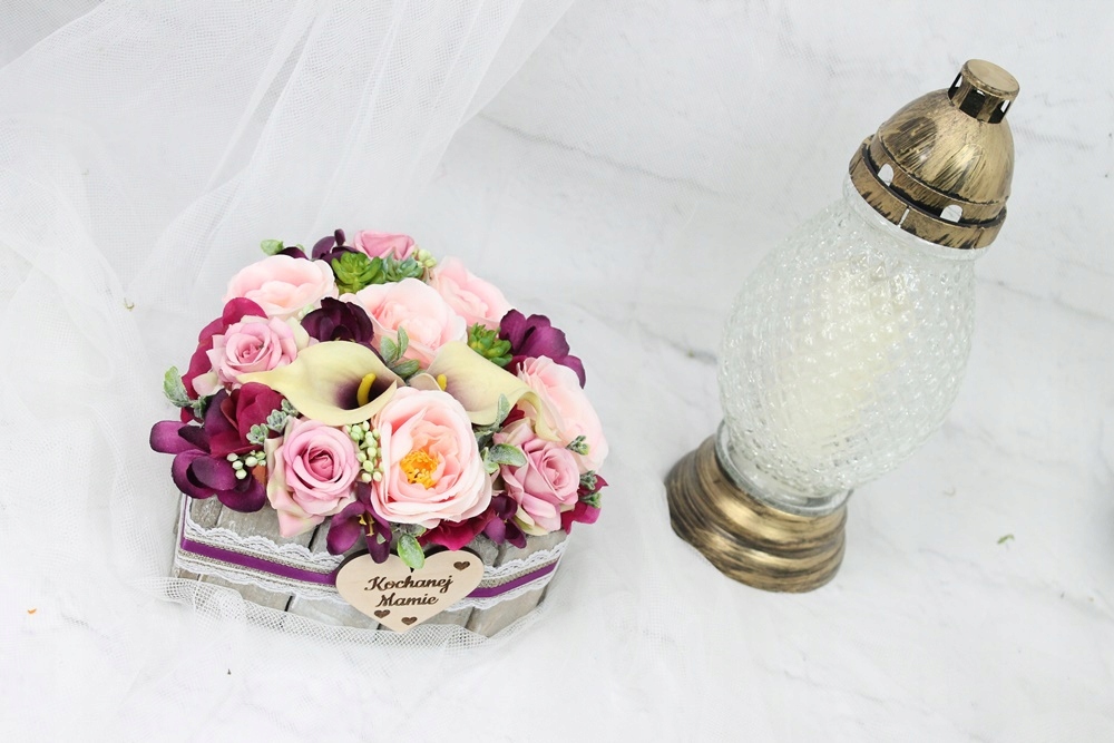 Додатковою прикрасою композиції є дерев'яне серце з написом.