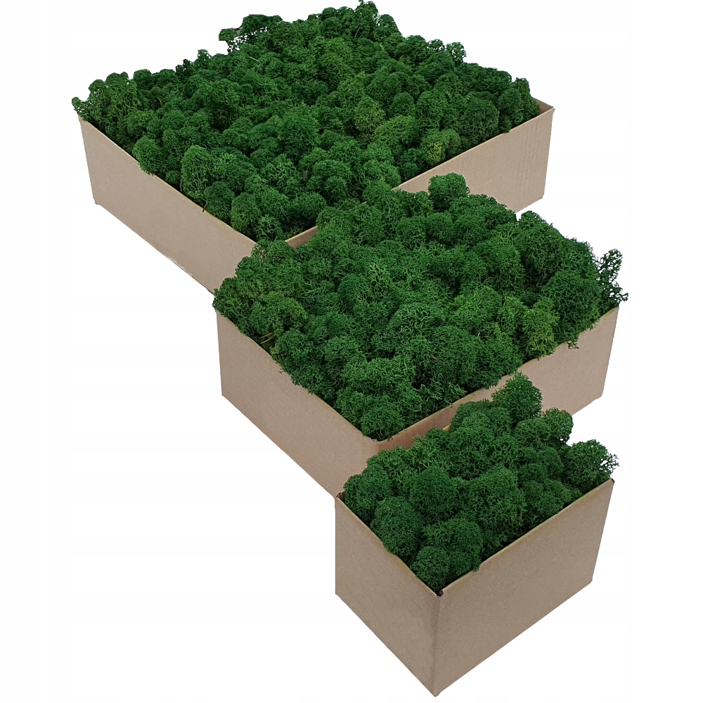 Темно-зелений крабовий мох із кольором пляшки красивого насиченого лісового зеленого. Якісний лишайник, з малою кількістю домішок у структурі. Товар упакований в картонну коробку 600г в один шар, естетично оформлений. Мох чистий і готовий до роботи після вилучення з коробки. Вихід однієї упаковки моху хроботка 600 г становить від 0,08 до 0,11 м2 площі поверхні (до 33х33 см).